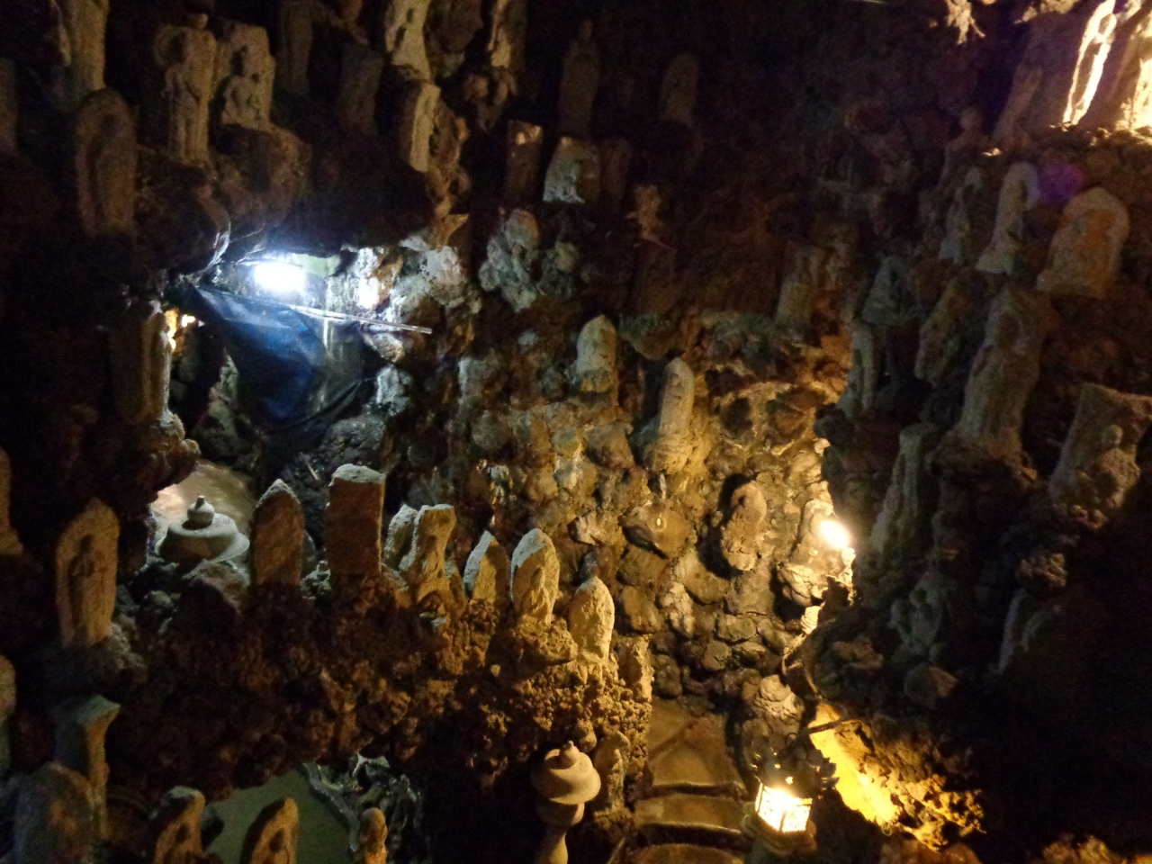 地下約15mに全長350mの隧道。富士山の熔岩と浅間山の焼石を鉄筋コンクリートで固めて岩組。石造の仏様が千体、滝まで流れています。