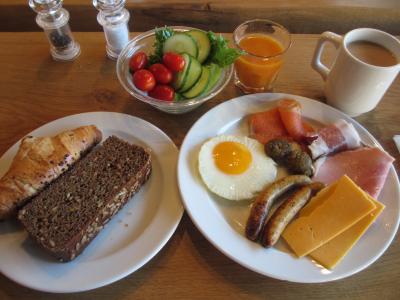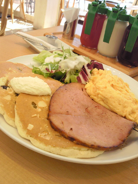 ドライフルーツとナッツが入ったパンケーキにサワークリームが食べやすいです。スクランブルエッグもボリュームがあって、おなかいっぱいになります。