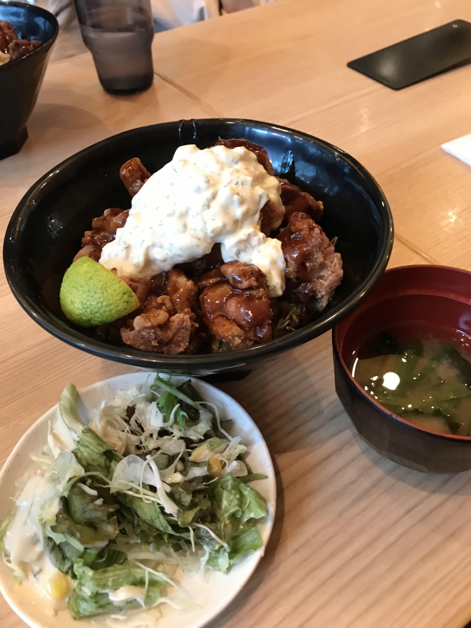 オフィスビルの中のお店だけあって、ランチタイムは会社員がたくさんです。男性が多い印象でした。それもそのはず、ボリュームたっぷりのランチでした。唐揚げとカキフライのどんぶりを食べました。大きなから揚げ5個はのせすぎでしょう。カキフライ3つもおいしかったです。どんぶりが来る前に食べ放題のサラダと味噌汁をしっかり食べて「ベジファースト」にしないと体を壊しそうです。嬉しい悲鳴ですね。