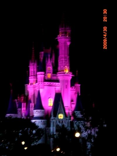 ライトアップされたシンデレラ城です。色も次々変わっていきます。