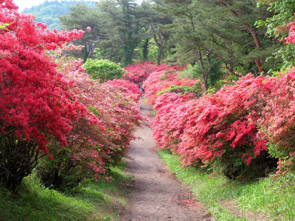 5月23日の金曜日の平日早朝、前泊した一関のホテルからレンタカーで行き登ってきました.駐車場確保が心配だったので、7時半ごろに着くようにホテルを出たため、楽々駐車出来ました。登山口あたりのつつじは見ごろがすぎて、花が散り始めていた株もありましたが、頂上までほぼ満開で、圧巻の眺めでした。写真を撮るために何度も立ち止まったにもかかわらず、約2時間後の9時半には登山口にもどることができました。登山口から頂上までは標高差約200mなので、シニアでも楽に登ることができます。快晴で雲一つない日を狙えば、気仙沼湾も見渡せるそうですが、私達が登った時は霞んでいて、見れませんでした。