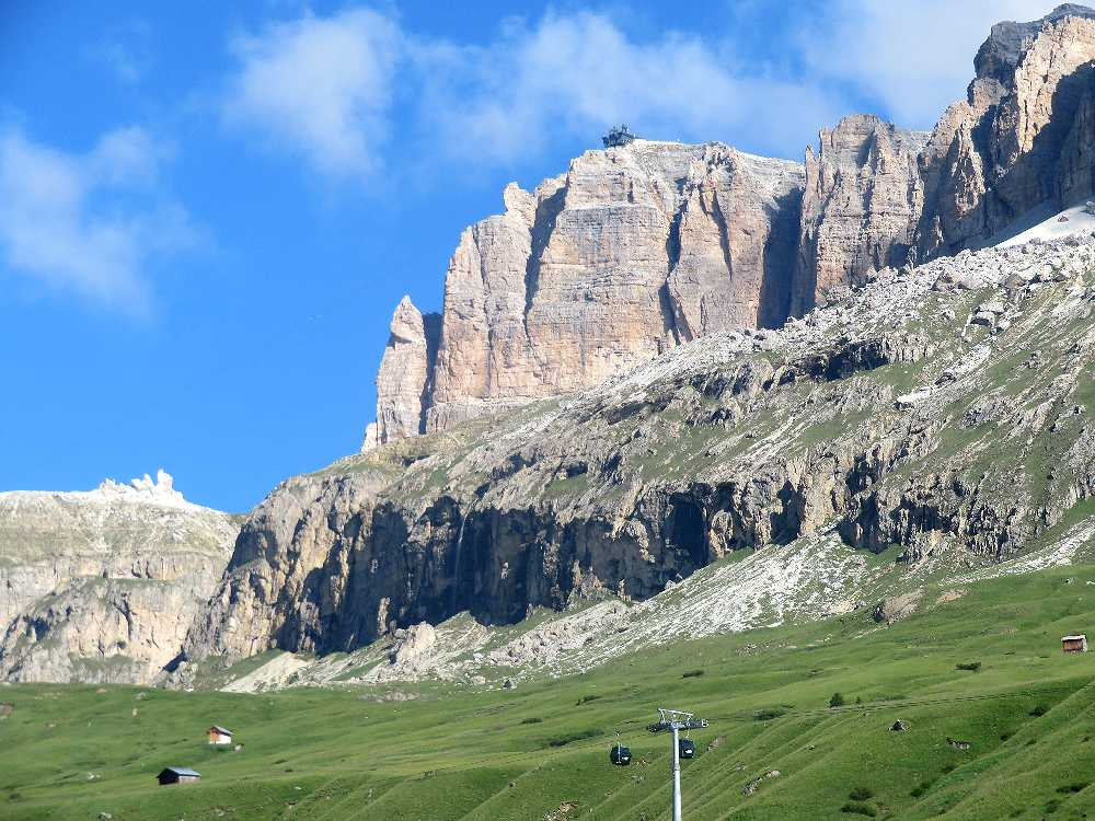 この峠は、セラ山群やマルモラーダやサッソルンゴの絶景が見れるドロミテの峠の中でも1,2を争う峠ですが、サイクリストやライダー等でかなり混んでいました。さらにサスポルドイヘのロープウエイで上に上がれば、360度月面にいるような景色とドロミテを代表する山々を同じ目の高さで眺めることもできます。ただしロープウェイ代は高く(往復30ユーロ)ですので、天気のいい日を選んで乗るのがお勧めです。私達は、カナツェイ側とアラッバ側の両方からレンタカーで峠に登りましたが、カナツェイ側からは見通しの効かない急なヘヤピンカーブの登りが続くのに対し、アラッバ側からは、セラ山群の雄大な景色を眺めながら登ることが出来るので、車で峠越えをするなら、アラッバ側からがお勧めです。峠はいつも混んでいるので、駐車場を確保するためにも、早朝おとずれることをお勧めします。