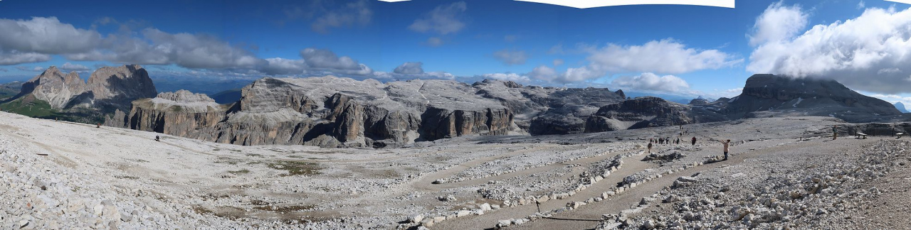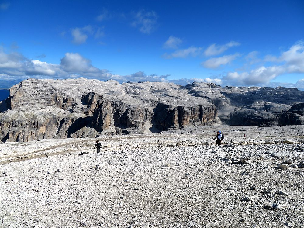 フィエル・デル・パン・トレイルは、フェダイア峠とポルドイ峠を結ぶ、マルモラーダ、セラ山群、サッソルンゴなどのパノラマの景色を望むドロミテで最も美しいトレイルの一つです。私達はアルバからゴンドラでCol dei Rossiまで上り、トレッキングをスタート。スタート地点から多少のアップダウンはあるものの、マルモラーダを見ながらトラバースするほぼ平坦な道の中ほど、フェダイア湖が見え始めるところ(Viel del Pan )まで歩き、マルモラーダをほぼ真正面に見ることができました。マルモラーダは、フェダイア湖沿いの道からも湖越しにその山容を見ることが出来ますが、湖畔は狭くて車の駐車が困難で、山が近すぎて全体が見えにくいので、このトレイルから眺めることをお勧めします。