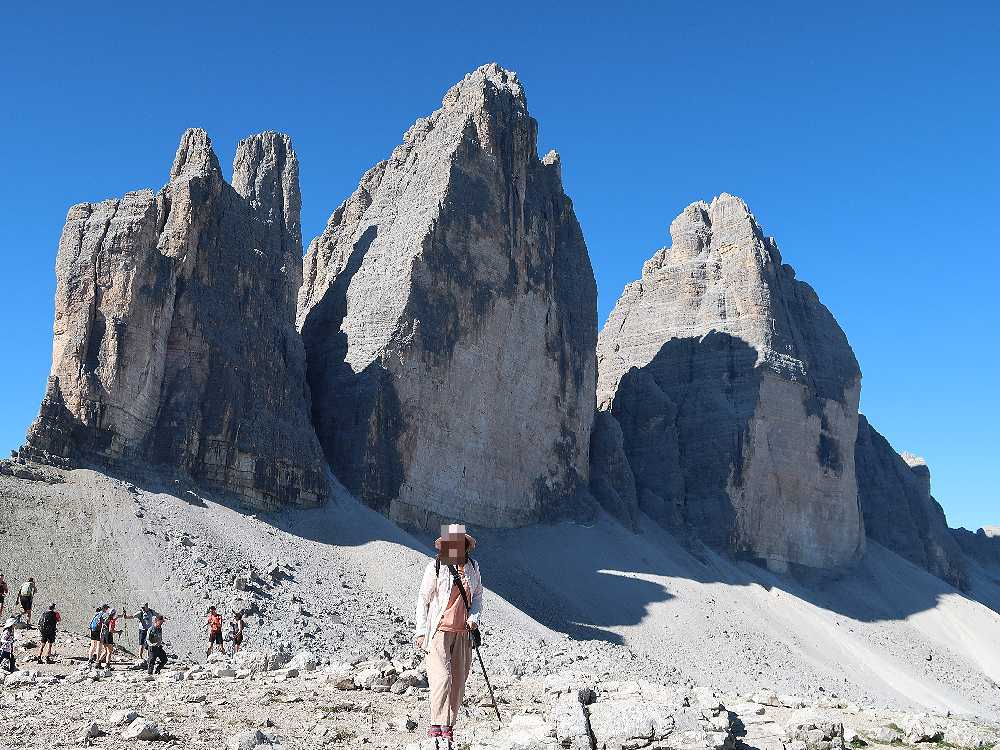 2025年6月末、アウロンゾの駐車場を7時半から予約して、トレチメの周回コース(9.7キロ)を反時計回りに一周しました。トレチメの南側に位置するアウロンゾ小屋からスタートし、ラヴァレード小屋を経て、Forcella Lavaledoの鞍部(2454m)を越した後、トレチメの姿が一番きれいに眺められるというロカテッリ小屋(2405m)に立ち寄りました。その後は、ラングアルム(牧草地)まで標高差200mほどの急坂を下り、その後に続く長い登り返しを経てラングアルム小屋(2283m)で休憩後、メッツォ峠(2315m)を越して、アウロンゾ小屋へと戻りました。二つの小屋の休憩時間等を入れて、計6時間強かかりました。快晴で暑い日だったので、急な坂を下った後の炎天下の登りはシニアにはきつかったです。