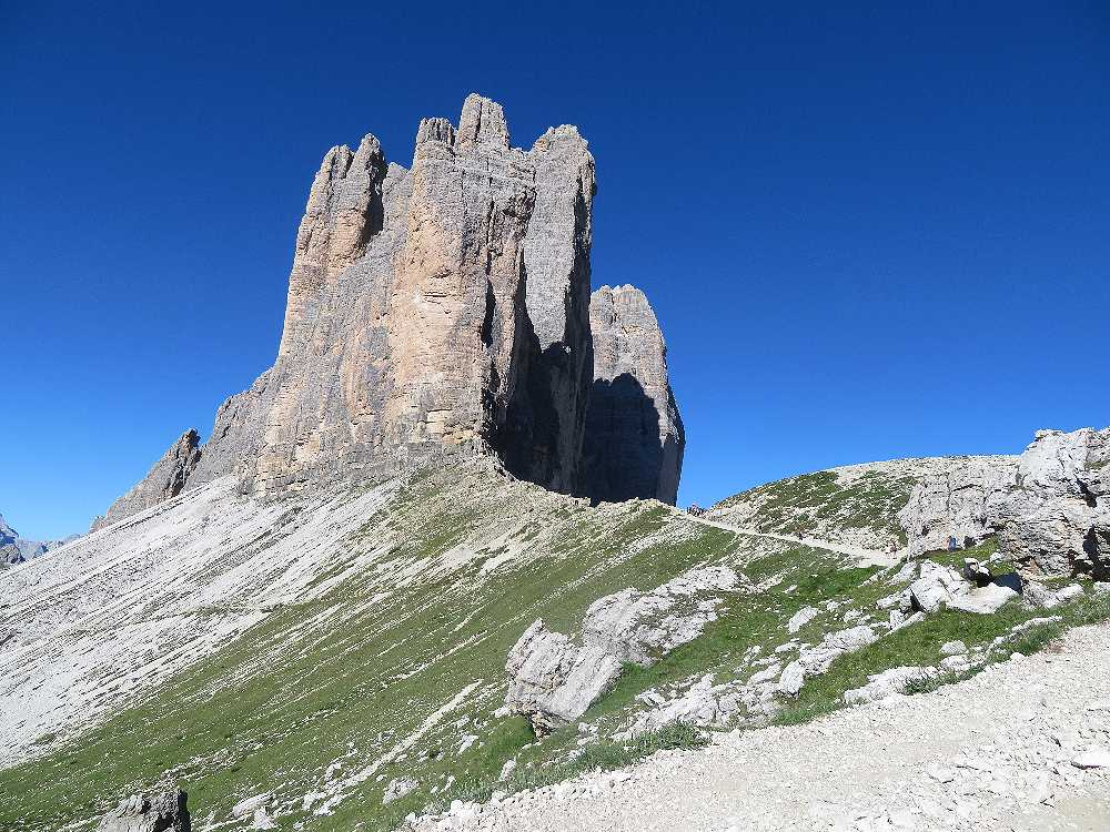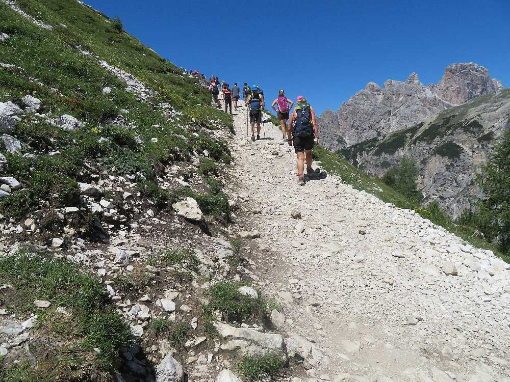 スタート地点(Passo Tre Croci 1809m)から往復約11キロにあり、湖の標高は1925mで、標高差はわずか116mしかありませんが、途中アップダウンがあるため、実際の標高差は600mくらいあったことを後で知りました。私達は他の方(健脚者)の口コミを信じて、このコースに挑みましたが、実際は初心者にはきつかったです。鎖場あり、道がない水場を渡ったり、鉄の階段を登ったり、道のない大きな石の上を歩いたりと、日本のアルプスを歩くのと大差ない道でした。苦労してたどり着いた湖は秘境の湖らしく、ターコイズブルーの色、そのそばに聳えるソラピス山。疲れを忘れさせるほどの絶景が待ち受けていました。小学生らしき団体も登ってきていましたが、下り初めに転んでけがをした子がいて、つきそいの先生たちが手当てをしていました。その後、私達はゆっくり時間をかけて下山しましたが、その子たちには追い付かれなかったので、その子たちの無事は確認できませんでした。私達のような高齢者や子供が手軽に登る道ではないということを実感しました。