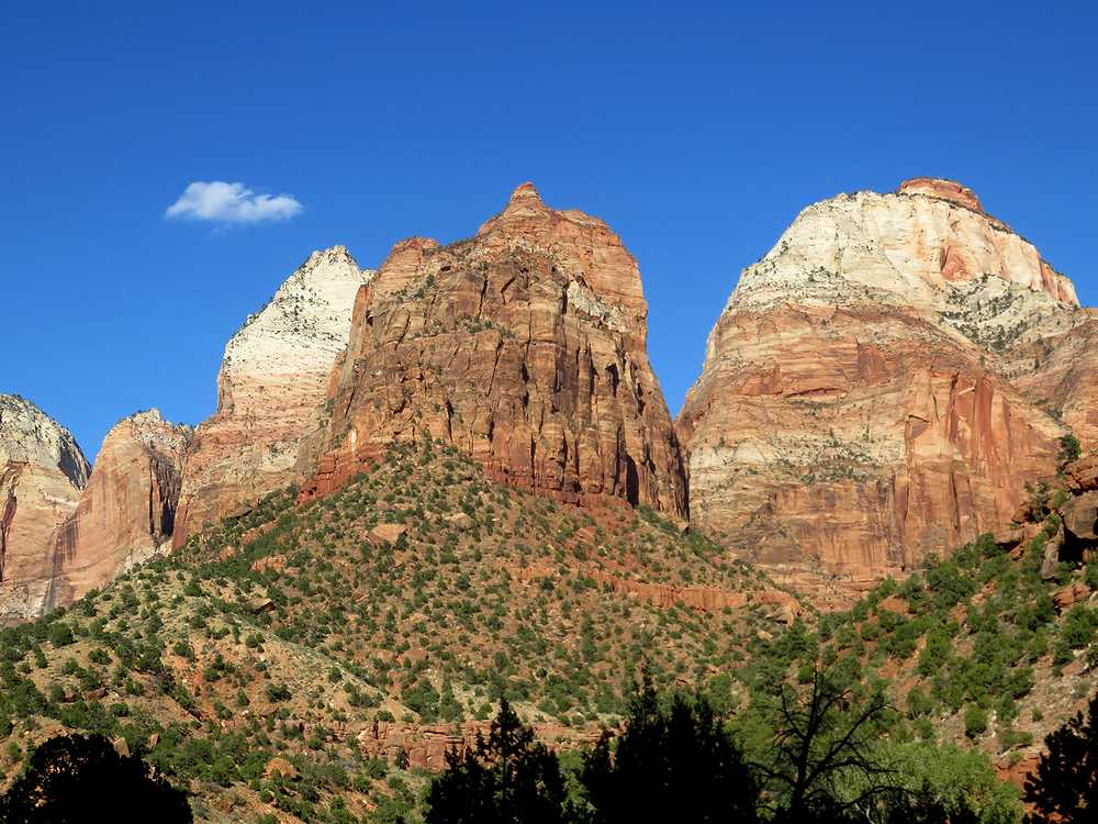 ザイオンキャニオンジャンクションからキャニオン・オーバールック・トレイルの往復とブライスキャニオンに向かうときの合計3回レンタカーで走りましたが、何度走っても素晴らしい眺めに圧倒されまくりで、助手席から撮影に忙しかったです。時間帯によって陽射しの当たり方が異なるので、見る景色が変わります。午前中グレートアーチの存在すら気付かなかったのに、午後は日ざしをいっぱいに浴び、順光で削ぎ落ちた穴がきれいに見えましたし、午前中真っ白に輝いていた、タワーズ・オブ・ザ・バージンの峰々は、午後には逆光でみえませんでした。公園一番の景勝地といわれているキャニオンオーバールックからのザイオン渓谷の眺めは午前中の方がいいが、公園内のヴューポイントも午前中のほうがいいところが多いので、1日だけの見学では足りないようです。私たちはザイオンが最初の訪問地だったため年間パスをヴィジターセンターで買えるものと思っていましたが、実際はゲートで購入しなければなりませんでした。ザイオンマウントカーメル・ハイウェイはゲートに入ってから少し走ったザイオンキャニオンジャンクションから東口までの道なので、通過するだけでも入園料(30ドル)を払う必要があるようです。有料でも一度は通過する価値のある絶景ロードでした。途中のトンネルでの交互通行での待ち時間はシーズン終わりに近い時期でもいらいらするくらい待たされたので、できれば夏の混みあうときは避けたほうが良さそうです。- 旅行時期