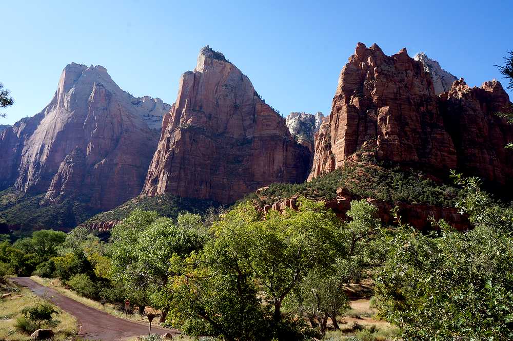 ザイオンで一番の景勝地だというので、シャトルバスに乗るのは後回しにして、そのままザイオンマウントカーメル・ハイウェイに向かいました。トンネル(1.1マイル)を出てすぐのところに駐車場があると聞いていたのですが、トンネル内が交互通行のため、前に待っている車がないにもかかわらず、10分ほど待たされました。夏の混む合うときはここでかなり待たされることを覚悟しなければならないと思います。駐車場は想像した以上に狭く、まったく空きがなく、しかも空き待ちのスペースもありません。辛うじて切り替えし駐車場を脱出できましたが、しばらく先へ走ってはみたものの、駐車できるようなスペースは見つけることができず、Uターンしてザイオン方面に戻る道沿いの空地に駐車できました。ただしザイオン方面に向かう道もトンネル手前で長蛇の列ができている場合は駐車も難しいかも知れません。幸い時間が早かったせいか(11時半ごろ)、その時は車列がそれほど長くはありませんでした。駐車したところからは5分ほど歩いたところで、トンネル手前右側にトレイルヘッドがありました。トレイルのアプローチで急な階段を登り、途中深い渓谷を見下ろす崖ぞいの道(ときには板張りの)が続き、あとは比較的緩やかな上りの道を歩くと展望台に到着します。片道30分の短いハイキングコースでした。展望台からは正面にタワーズ・オブ・ザ・バージンの峰々が見え、右側にはグレートアーチ、下の方には走ってきた九十九折のザイオンマウントカーメル・ハイウェイが見渡せます。私はハイウェイ途中の眺めがあまりにも凄すぎて圧倒されていたので、ここからのながめは山が遠い分、迫力に欠ける気がしました。9月末とはいえ、晴れている昼間は日ざしが強く、帽子と水は必須です。トレイルの出口付近では4頭のビックホーンシ―プに出会いました。どうやらこの辺に住んでいるらしく、出会う機会は多そうです。