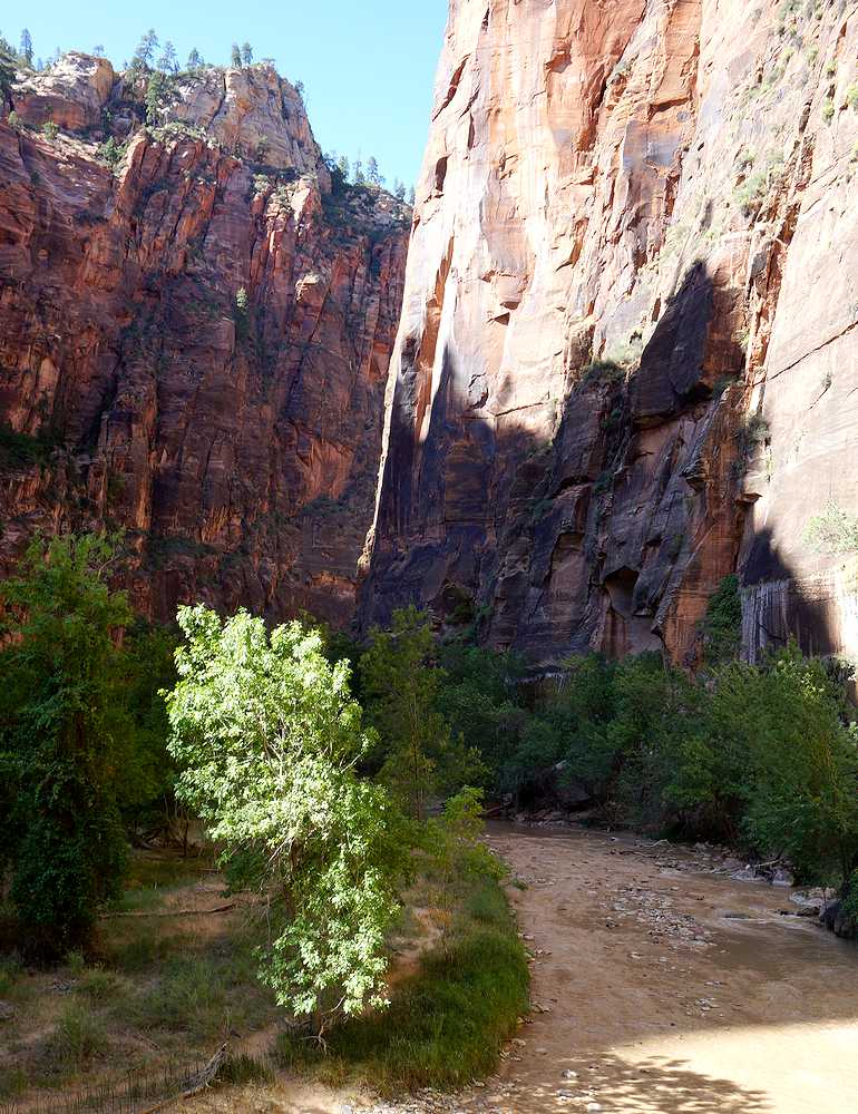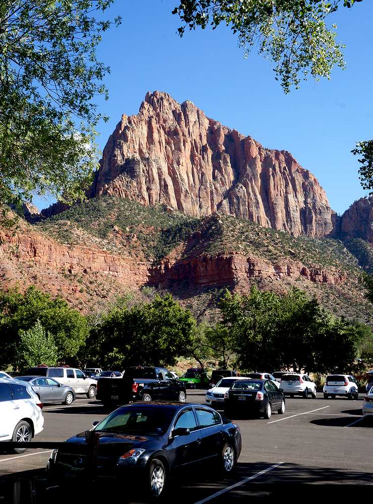 ザイオン国立公園内はシャトルバスで移動しなければならないので、駐車が問題だということを聞いていたので、ラスベガスに宿泊した翌朝早くに出発して、4時間後(時差があるの実際は3時間)の10時過ぎにザイオンに到着。先にキャニオンオーバールックへのハイキングを済ませてから、昼過ぎにヴィジターセンター前の駐車場に行きました。すんなりと駐車できました。シャトルバスに乗る前にトイレのマークのある方向に歩いて行き(この時点で公園ゲートを出たことに気付かなかった)、トイレをすませたところ、シャトルバスが止まっていたので、行き先も確かめもせず、乗りこんでしまいました。ところがこのバスが公園とは逆のスプリングデール行きのバスで、結局スプリングデールの町を一周りしてからまた公園にもどることになり、30分もロスをしてしまいました。戻った後で、公園終点を往復しているバスの乗り場は別の場所にあることがわかり、そこまで移動。その途中にゲートがあり、年間パスの提示を求められましたが、パスは車の中に置いてきたと言うと、これから気をつけるようにと、通していただきました。パスは常に携行したほうがいいでしょう。目指すバス停は駐車場すぐ横のヴィジターセンターの前にありました。シャトルのバス停は2カ所あり、バスもスプリングディール行きと、公園の奥行きとの2系統に分かれているので、私たちのような間違いはしないように注意してください。