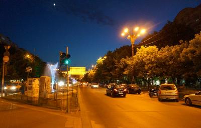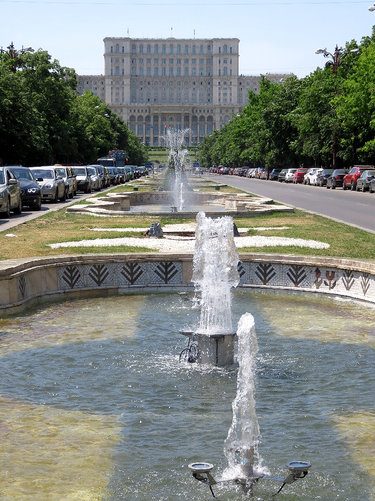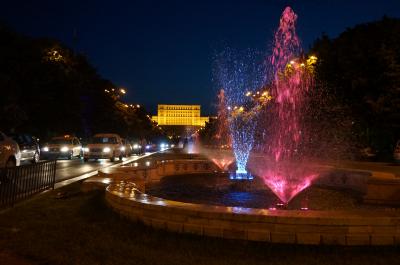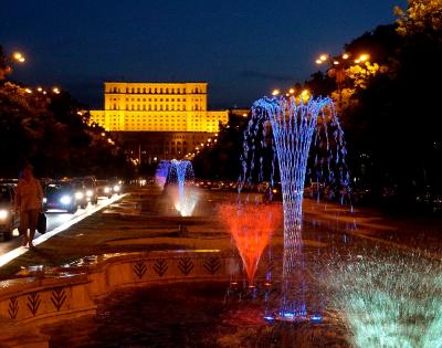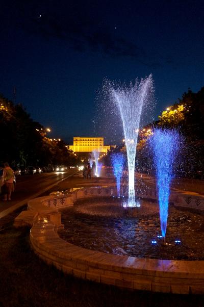 2015年の5月下旬、ルーマニア旅行の最後にブカレストに一泊しました。ブカレストの観光は国民の館だけに絞り、ホテルに見学の予約を頼みましたが、あいにく満杯で予約できず、内部は見ることはできませんでした。それならせめて夜景でもと思い、夜の9時過ぎに、一人ホテルから統一広場まで歩いていき、統一広場から国民の館まで伸びる統一大通りの横断歩道の中間地点から、夜景を撮影しました。統一大通りの中央分離帯の中には、館まで数多くの噴水が連なっていて、それぞれの噴水の水の色が時々刻々と変化しながら、噴水も上がったり、下がったりを繰り返していて、思いがけず素晴らしい夜景でした。統一広場の近くは夜でも人通りが多く、危険な感じは全くなかったので、ブカレストの観光名所の一つとしてお勧めです。なお、後でわかったことですが、国民の館の見学は予約がなくてもできる可能性はあるとのことでした。