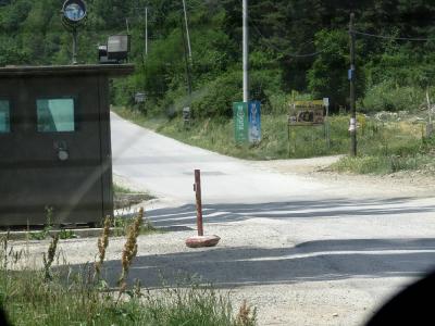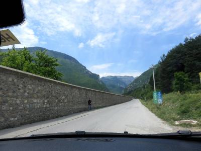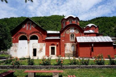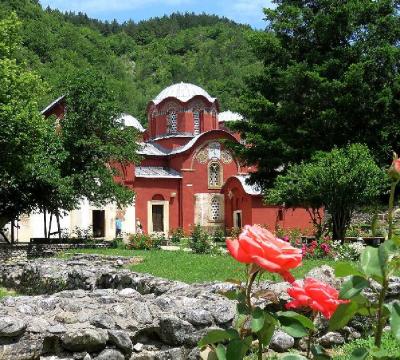 2015年6月にレンタカーによるバルカン半島一周ドライブ旅行の最後に訪れました。コソボの中の数少ない観光名所のひとつ。ペヤの町の西のはずれにあり、修道院は長い塀で囲まれていて、塀の外からは見えません。入り口に監視員のいる小さなボックス型の小屋があり、そこで1人だけのパスポートを預けると、バーを揚げてもらえ、正門から修道院の敷地に入ることができます。長い塀に沿ってしばらくアプローチを走ると、修道院の門の前に広い無料駐車場があります。門の中に入ると、赤い壁が印象的な修道院が初めて姿を現します。修道院の中には、グループが先に入っていたせいか、入場料も払わずに入れました。外壁に少し残されたフレスコ画や内部の壁一面に埋め尽くされた古いフレスコ画はみごとです。内部が撮影禁止でなければ、ばしばし撮影したいくらいすばらしかったです。花が咲き誇る美しい庭を一回り見て回った後で、土産物担当の修道僧が近づいてきて、一人2ユーロの入場料を払うようにいわれました。以前はお布施を要求されたと書いていたブログを読んだことがありましたが、今はきちんと入場料を払うことにしたようです。駐車場横にはきれいな川がながれていました。塀横の道をまっすぐ行くと深い渓谷が見れるようです。
