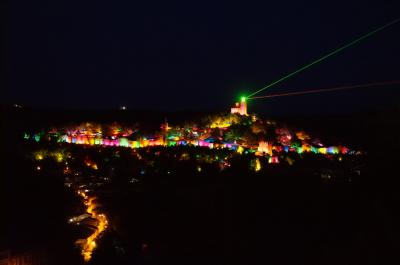 2015年5月23日の土曜日、ヴェリコタルノボのホテル(Minotel Rashev)に宿泊した。その夜の9時ごろ、あたりが暗くなり、建物や道路が点灯されたのにもかかわらずツァレヴェッツの丘は真っ暗のまま。半ばあきらめていたら、ホテルの前に人が集まりはじめたので、カメラ持参でホテル前の道路の手すり前に陣取った。9時半すぎに突然鐘の音とともに光のショーが始まり、15分で幕を閉じた。光の色や場所が時々刻々と変化するダイナミックなショーで、十分楽しめた。このショーは、団体の観光客のリクエストにより開催され、常時行われるわけではないというが、観光シーズンの土日には見れる確率が高いようだ。このショーには、3本のレーザー光線と様々の色のライト、ドラマチックな音楽と教会の鐘の音が使われ、ベリコタルノボとツァレヴェッツの丘の長い苦難の歴史物語を表現していることを後で知った。