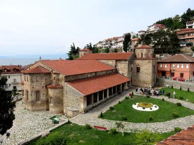オフリド旧市街の比較的湖に近いところに建つ大きな教会。11世紀に建造され、オスマン帝国統治時代にモスクに改造されたが、第二次世界大戦後に元のキリスト教会にもどされたという。入場料(一人200円ほど)を払い中に入ると、ちょうど地元の子供たちがコンサートのためにリハーサルの真っ最中だった。レベルがあまりにも高かったので、演奏中は椅子に座って聴きほれていた。交代する合間に移動して内部の古いフレスコ画を見て回り、邪魔にならないように気遣いながら、早々に外に出た。内部は撮影禁止で、ゆっくり見学できなかったのが心残りだった。大聖堂の前は比較的広い庭になっていて、周りにはしゃれたレストランもあった。私たちは、大聖堂そばのゲストハウスに宿泊したので、宿のテラスで大聖堂を眺めながらのんびりすごすことができた。