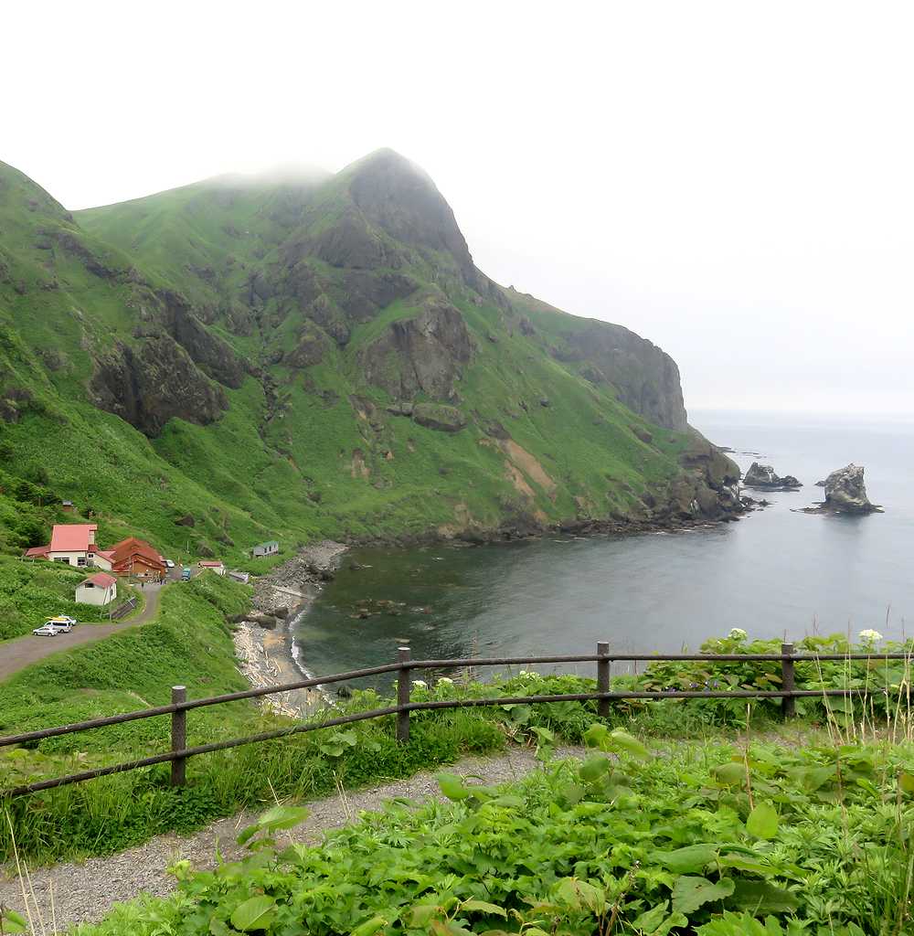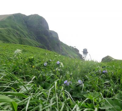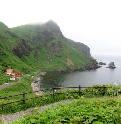 猫岩は、桃岩展望台トレッキングコースを歩くと、キンバイの谷付近の尾根から見下ろすことができますが、ここからだとただの岩にしか見えません。同じコース上にある桃岩展望台からは、遠くて小さいものの、猫背の猫の後ろ姿に見ることができました。一方、翌日に行った桃台猫台展望台からはより近くに見ることができ、はっきりと猫の両耳や後ろ向きに座っている姿を確認することができます。ただし、海鳥のコロニーになっているのか、表面は排泄物で真っ白に汚れていました。猫好きにはたまらない姿かもしれませんが、猫嫌いの私にはすぐ近くに聳える桃岩に目を奪われていました。