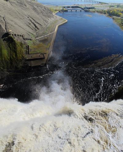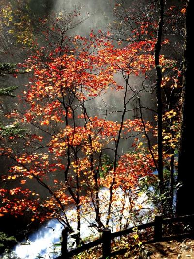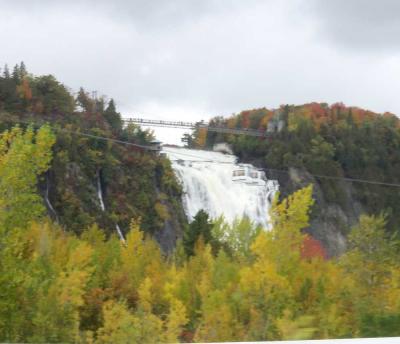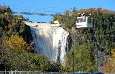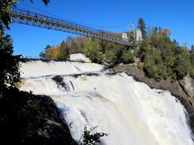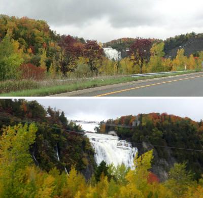 ケベックからシャルルボア方面へ車で走ると左側に急に姿を現します。さらにオルレアン島からケベックへと戻るときは橋のほぼ正面に見え、ケベック方面にもどる道に入る直前にも紅葉越しに美しい姿を見ることができます。私達は2012年には上のつり橋近くの駐車場に車をとめて、橋から滝を見下ろしました。水しぶきをあげて一気に水が流れ落ちる様は迫力あります。虹も出ていました。滝横の公園の紅葉もきれいです。2019年は時間がなかったので、車から見ただけですましました。ここも紅葉の時期がお勧めです。