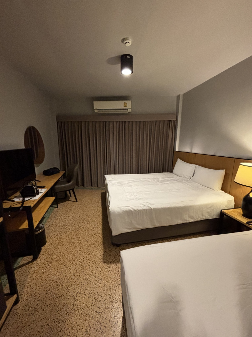 部屋は狭いので大きいスーツケースを広げるのはスペースに困るかもしれませんが寝るだけなら充分です。- 旅行時期