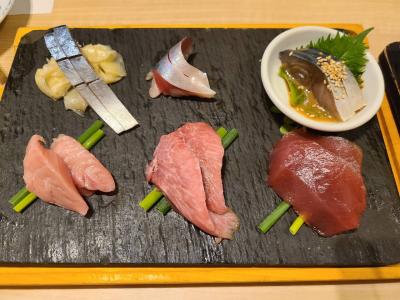 本マグロとトロサバの合盛り、ザンギサバスモークと色々豆のサラダ、九条ネギのだし巻き卵などを注文しました。