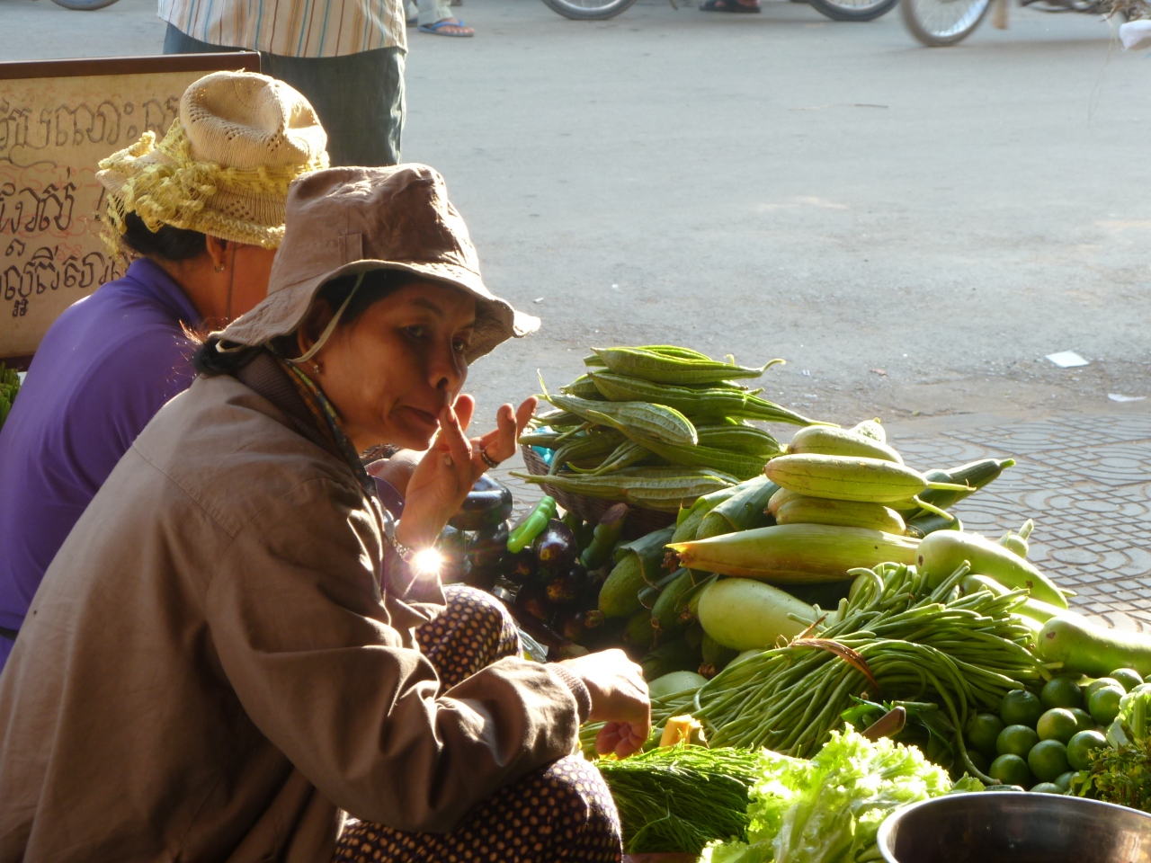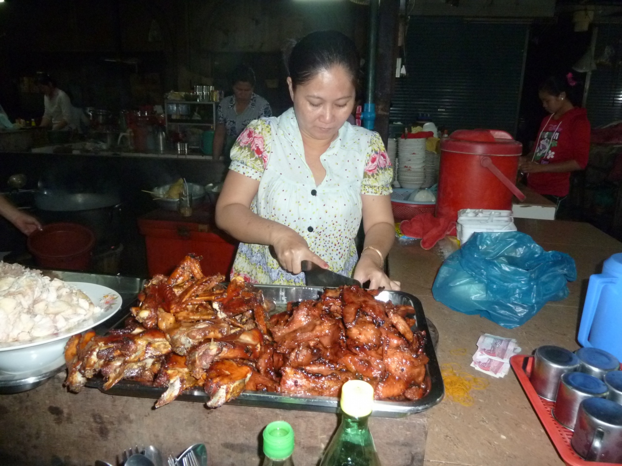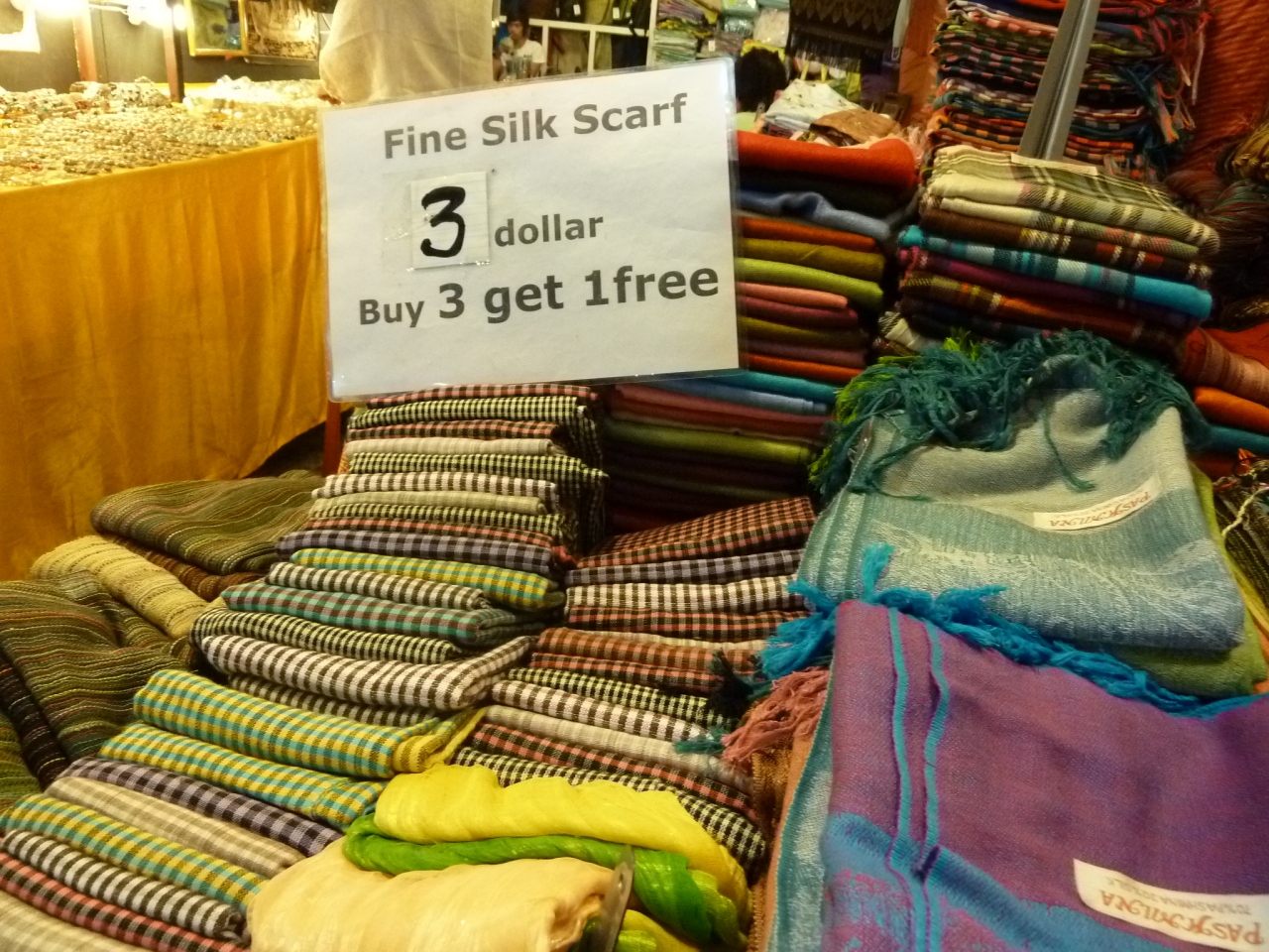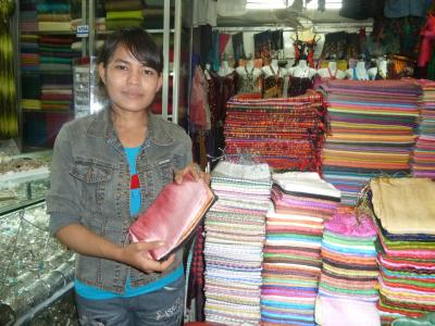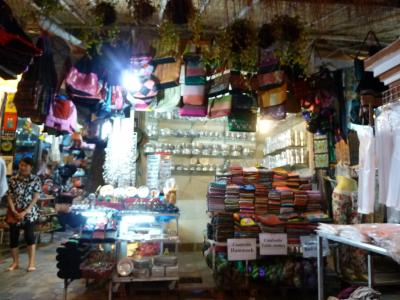 何回も通いました。品揃えは、雑貨・クロマー・スカーフ・服等と、食品部門(鶏・豚・魚・青果・軽食・スパイス・お茶等)もあります。朝は食品部門が6時くらいからオープンしてます。朝食は米粉で作った「クイティウ」というカンボジアの細い麺。激ウマでした。ライムとか葉っぱとか自分でアレンジするみたいです。2日間はここで朝ごはん。夜はビールを持ち込んでカウンターで鶏の唐揚げと春巻きでかんぱーい☆うまうま。買ったものは、クロマー5枚(各1ドル〜2ドル)、黒胡椒500g4ドル(白胡椒をおまけにくれた)、絹の手作りスカーフ3枚14ドル→11ドル、今思えばちよっと高いかな? 食堂はゼヒゼヒ利用してみて下さい。