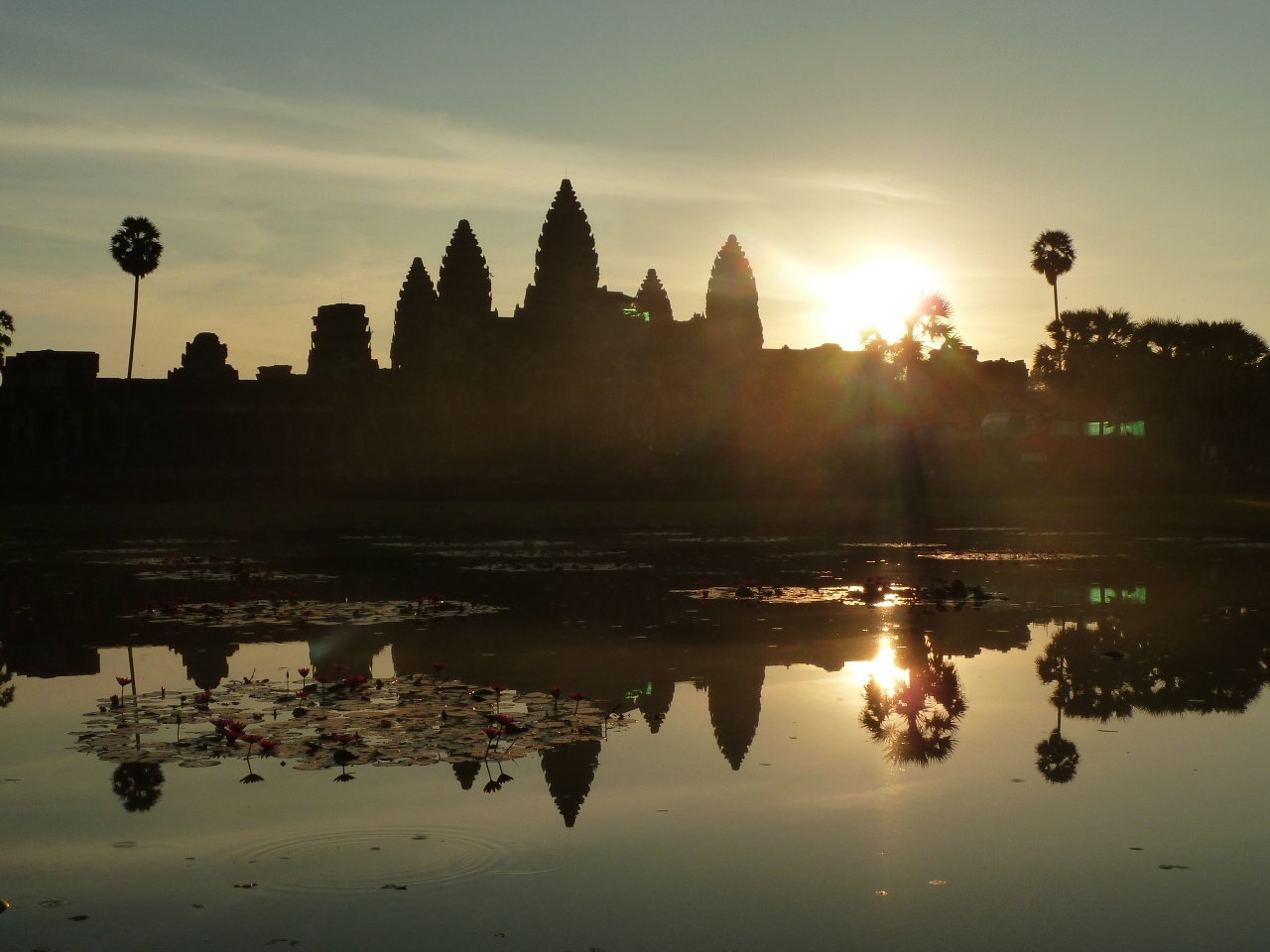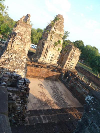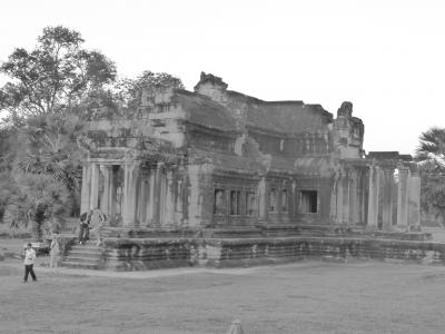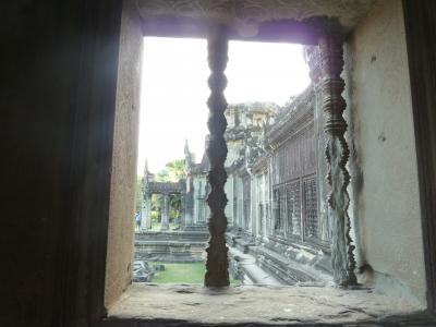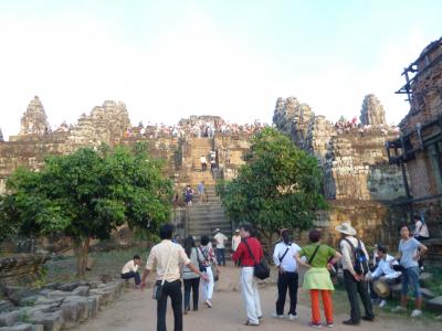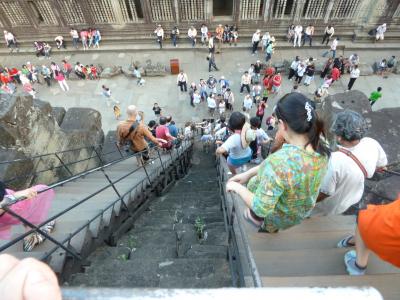 アンコールワット。1国の国旗にデザインされる象徴的な建物です。それくらいしかないから国旗にデザインされているのね~とタカをくくってました(すみません)その規模・精度・緻密さ・美しさ・ユニークさ、どれをとっても超一級。大きいだけでない見応えのある世界遺産。サンライズは2回。昼間も2回。見に行きました。建物の壮麗さもすごいですが、アプサラ・デバターの表情・衣服・髪型の種類の豊富さに1体1体、カメラに収めたいくらい素敵でした。乳海攪拌の巻き絵風な壁画も素晴らしかった。上にあがるには今は階段がついていて、係りの人がいて時間制限があり、最後の時間に間に合いました。