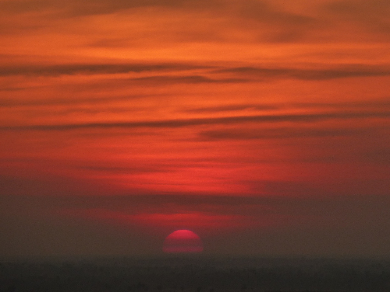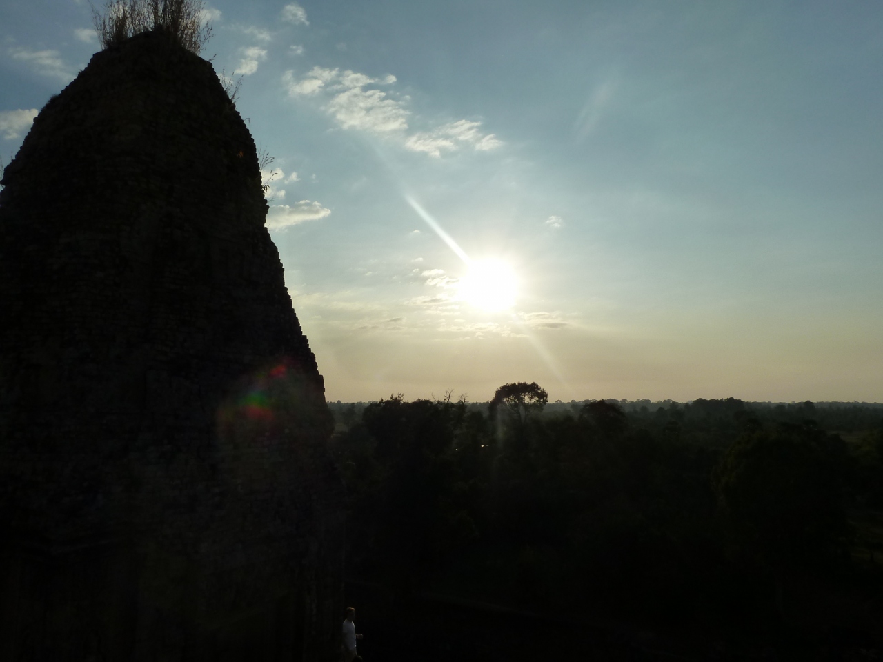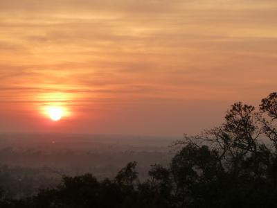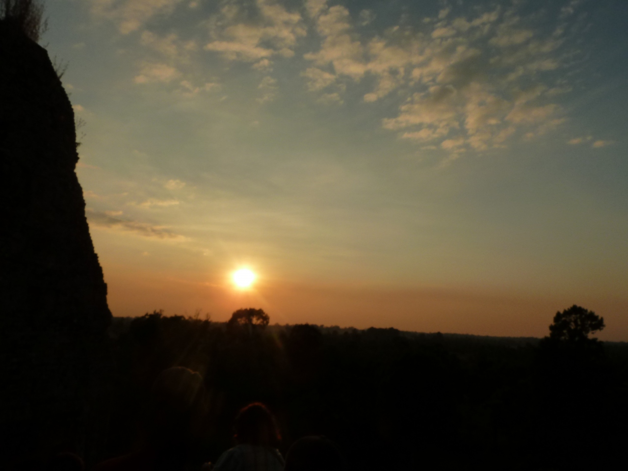 ここから見る夕陽は本当に綺麗でした。木々の間に沈んでゆきます。高い遺跡は階段がたくさんあり、1つ1つの段が結構高いのでよじ登った感じです。上は広いテラスのようになっていますが、人が多く密度は濃かったです。:日没。だんだんと茜色に染まる空。夕陽が完全に沈むと自然と拍手が巻き起こりました。その後まだ夕焼けが続きますが、しばらくするとあたりが暗くなります。暗くなってしまうと階段が急なので結構危険です。ある程度で帰られた方がいいと思います。