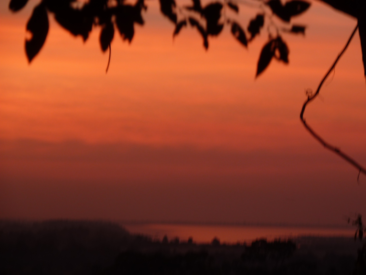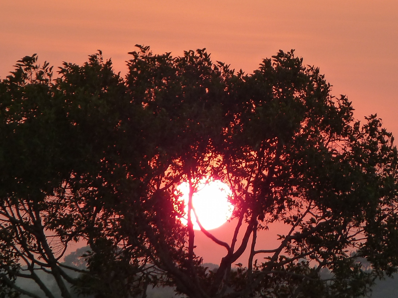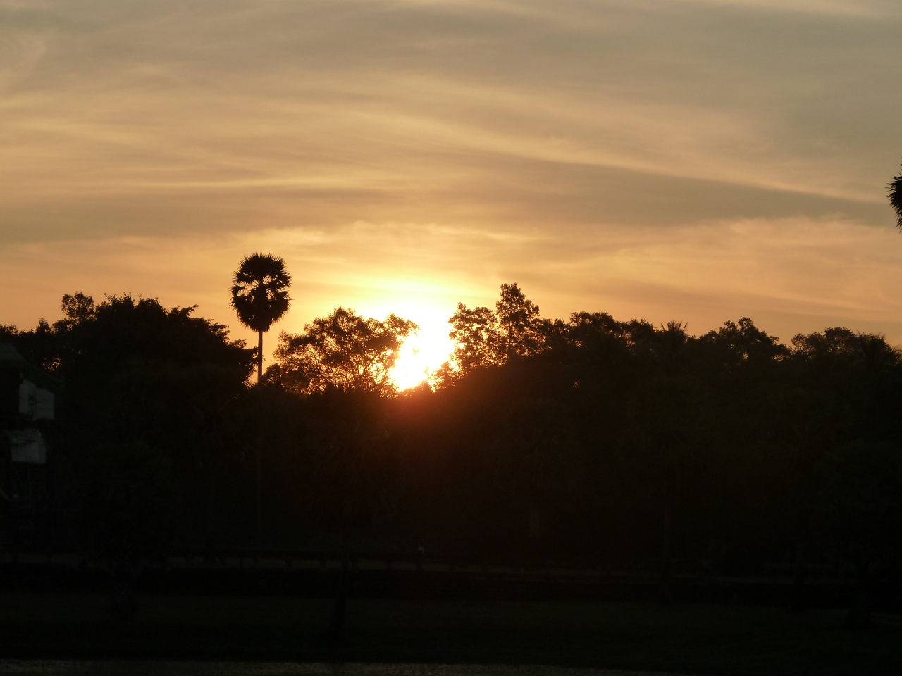 ここから見る夕陽は本当に綺麗でした。木々の間に沈んでゆきます。高い遺跡は階段がたくさんあり、1つ1つの段が結構高いのでよじ登った感じです。上は広いテラスのようになっていますが、人が多く密度は濃かったです。:日没。だんだんと茜色に染まる空。夕陽が完全に沈むと自然と拍手が巻き起こりました。その後まだ夕焼けが続きますが、しばらくするとあたりが暗くなります。暗くなってしまうと階段が急なので結構危険です。ある程度で帰られた方がいいと思います。