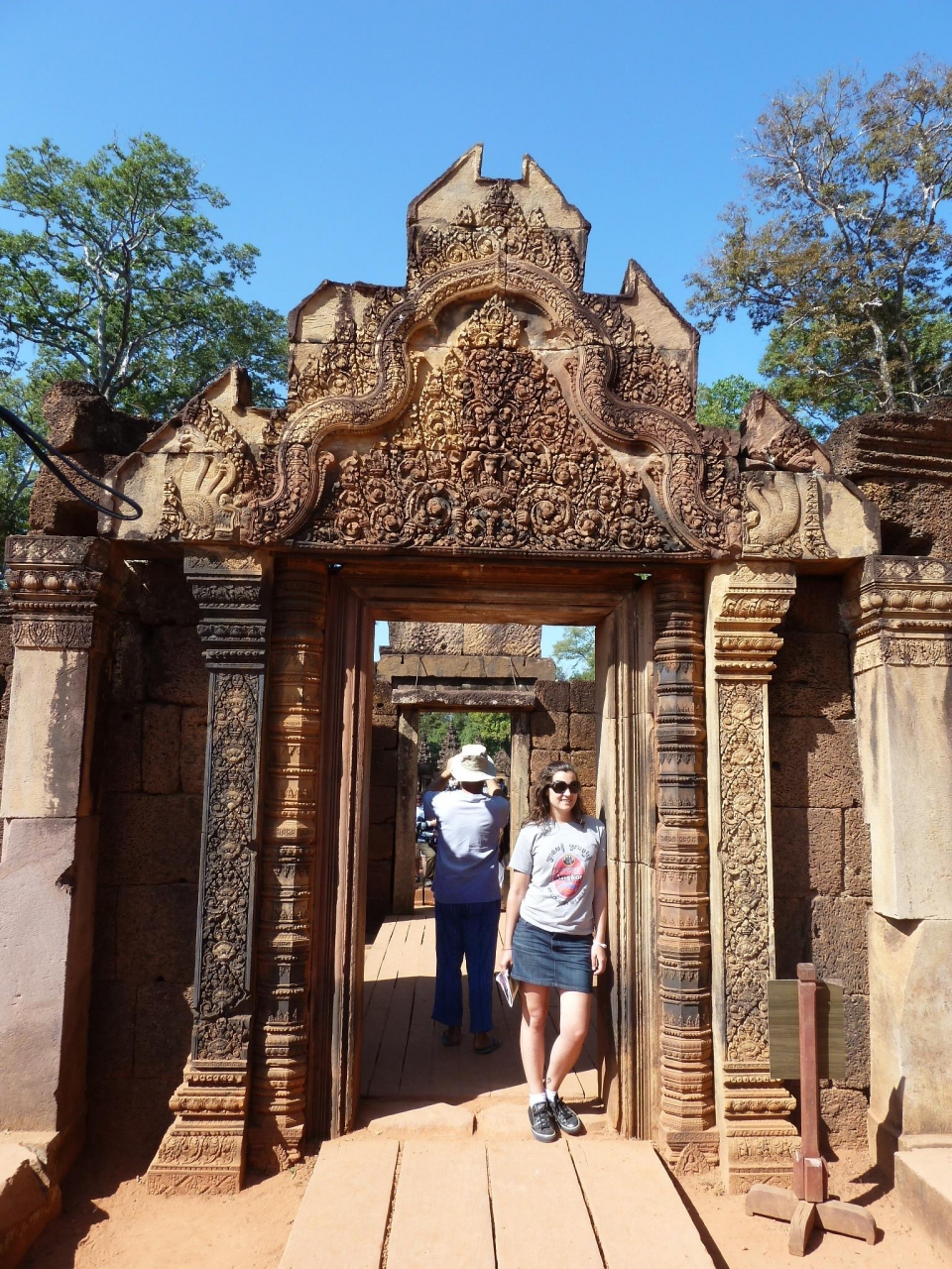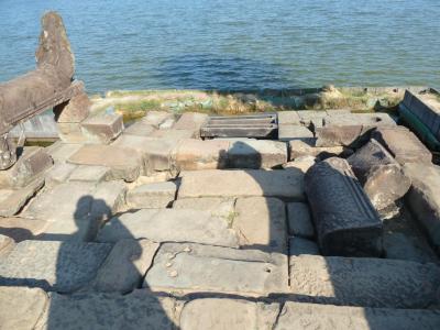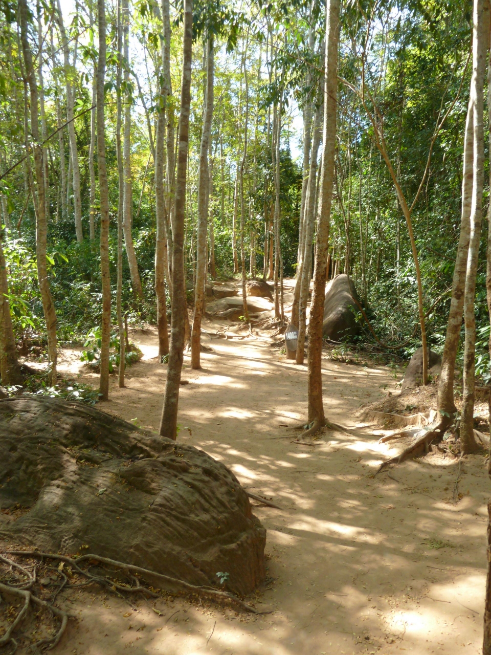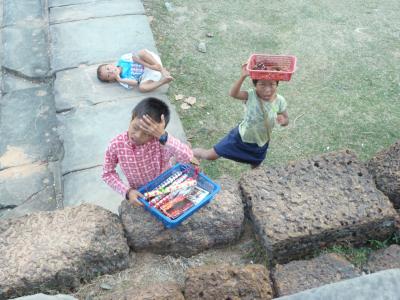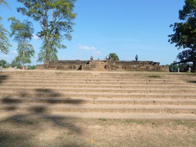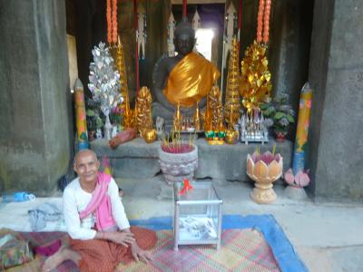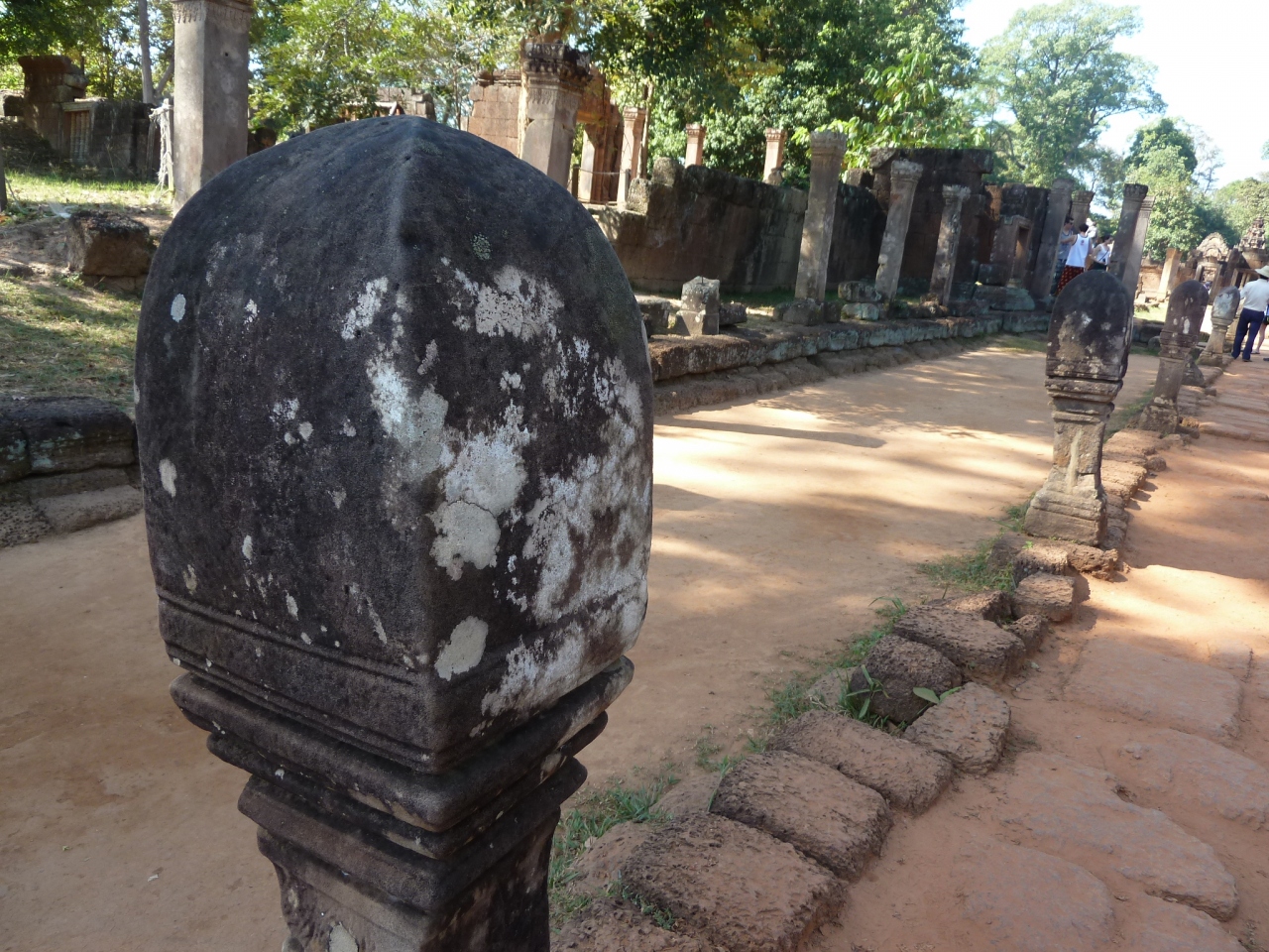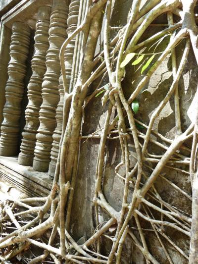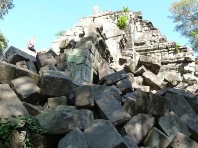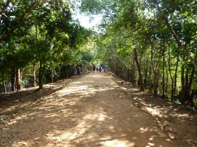 入口のレストランで3ドルの焼きそばと1ドルのコーラでランチして、一人ででかけた。40分ほど山道を歩く。一人になることはなかった。でも人は多くない。ところどころ木に赤いマーキング。これから先は地雷撤去のための調査をしていないから、入っちゃダメよという印。ひゅ~。さらさらした砂地の道を歩き、途中大きな岩がたくさんあったり、緑を楽しみながら遺跡へ到着。そこにはロープが張られていたり、保護官のような人たちが3人。私が進みすぎると帰ってくるように指示あり。乾季なので今いち水が多くない。