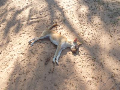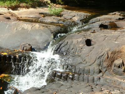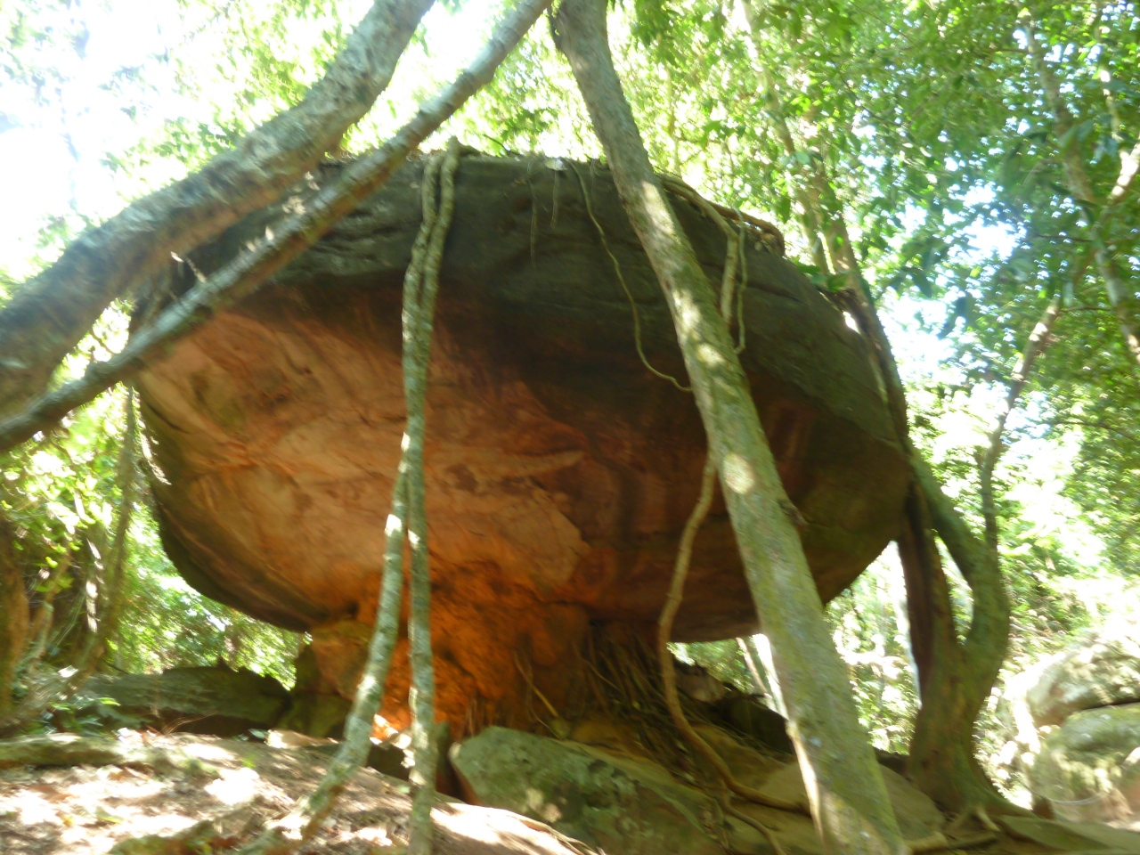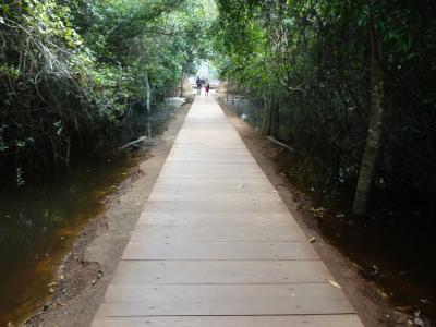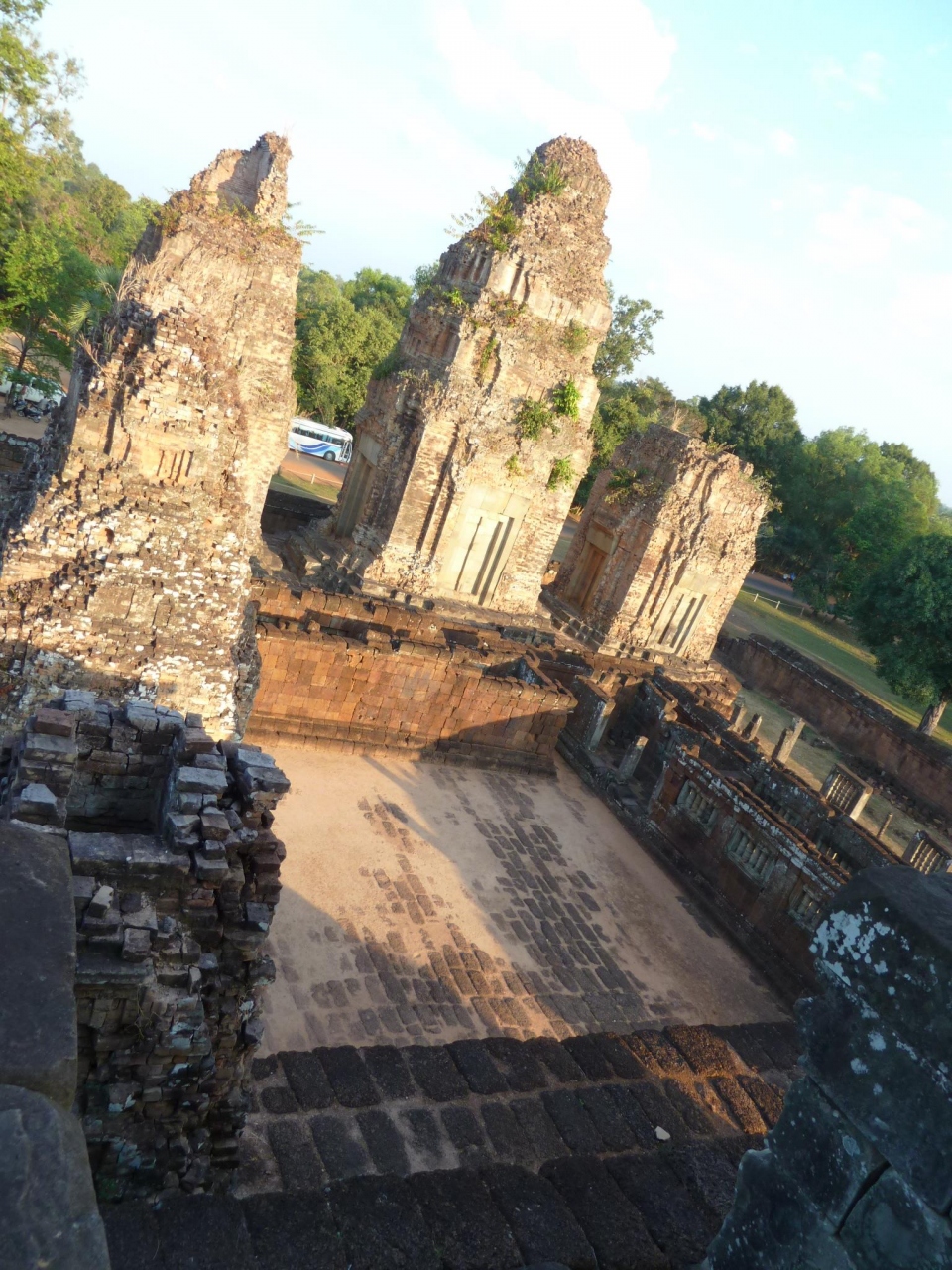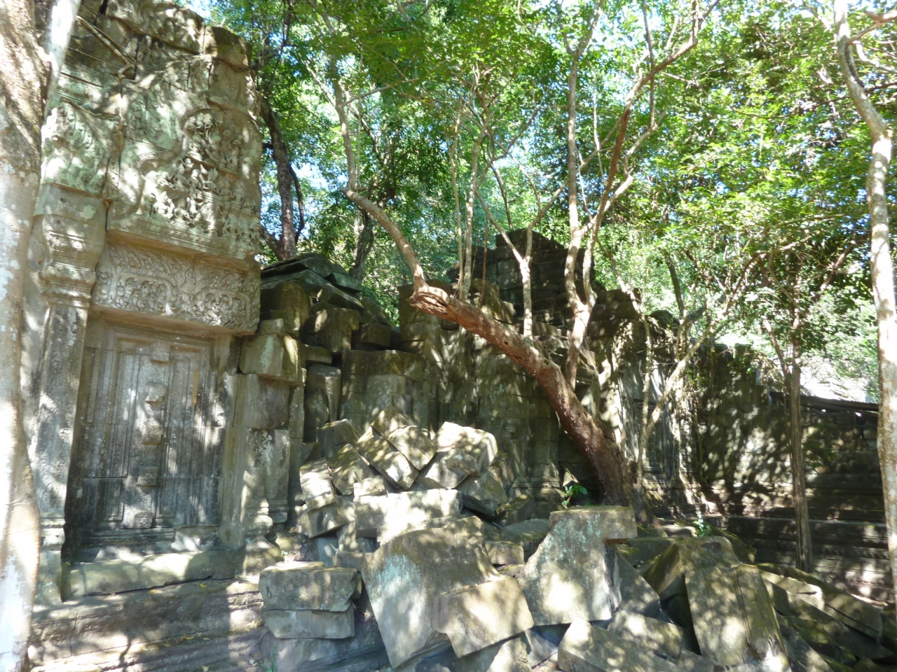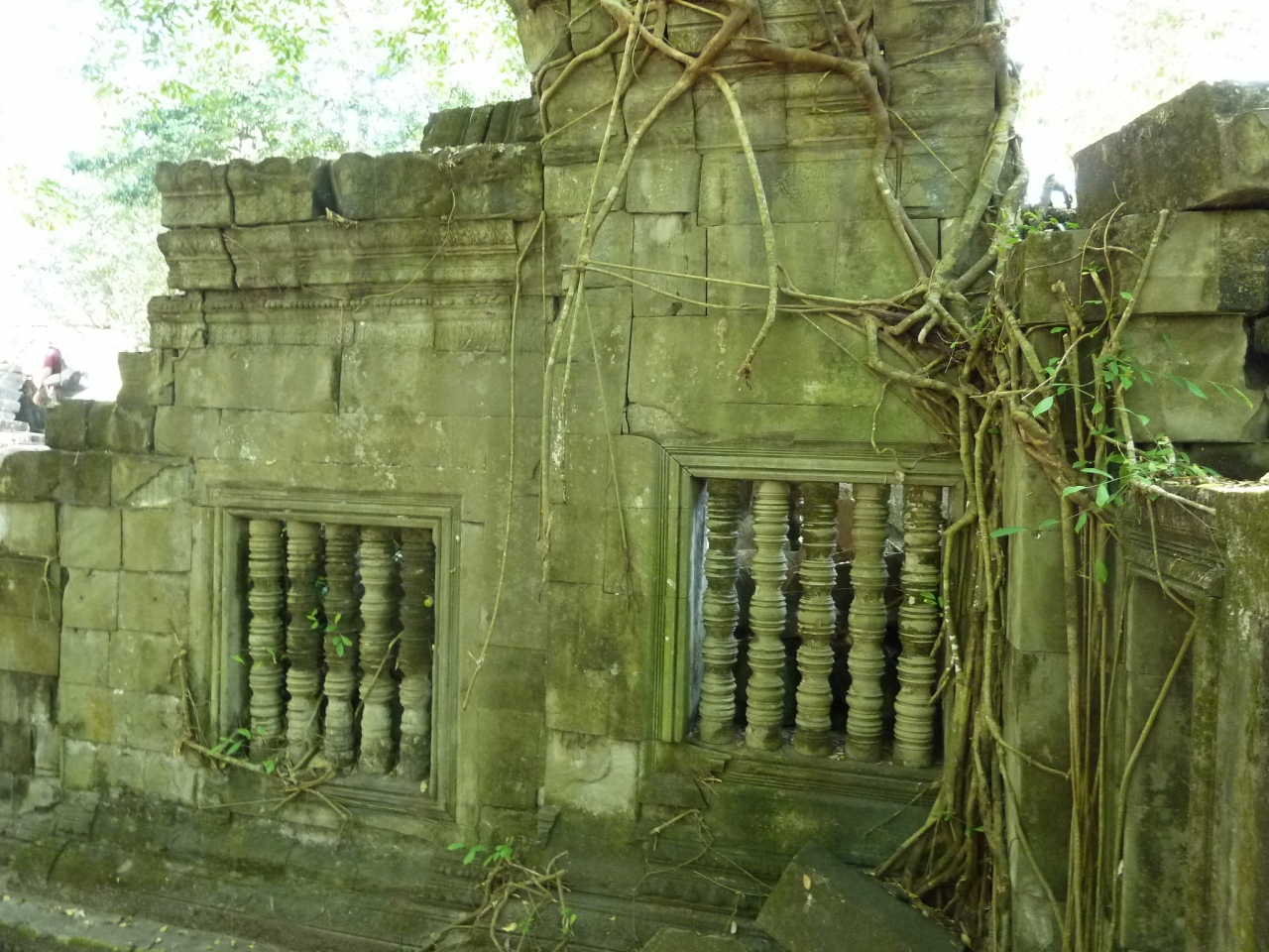入口のレストランで3ドルの焼きそばと1ドルのコーラでランチして、一人ででかけた。40分ほど山道を歩く。一人になることはなかった。でも人は多くない。ところどころ木に赤いマーキング。これから先は地雷撤去のための調査をしていないから、入っちゃダメよという印。ひゅ~。さらさらした砂地の道を歩き、途中大きな岩がたくさんあったり、緑を楽しみながら遺跡へ到着。そこにはロープが張られていたり、保護官のような人たちが3人。私が進みすぎると帰ってくるように指示あり。乾季なので今いち水が多くない。