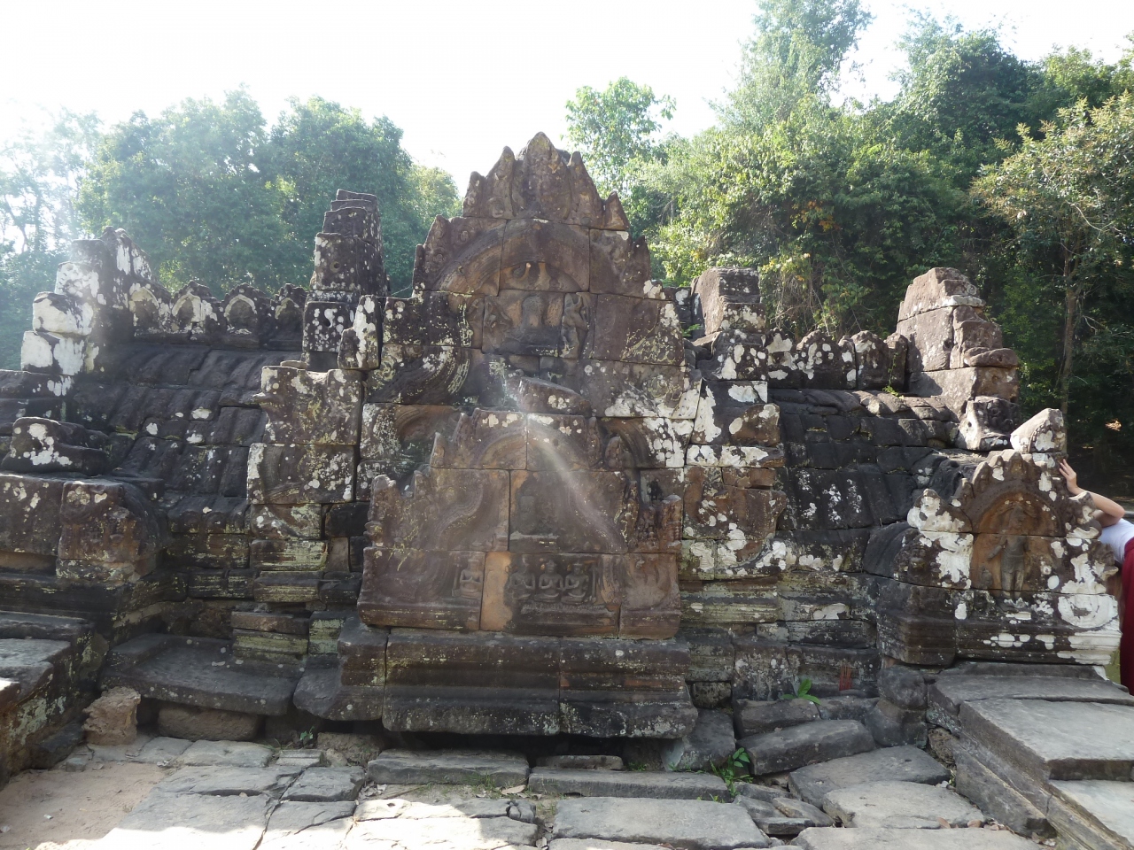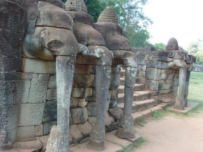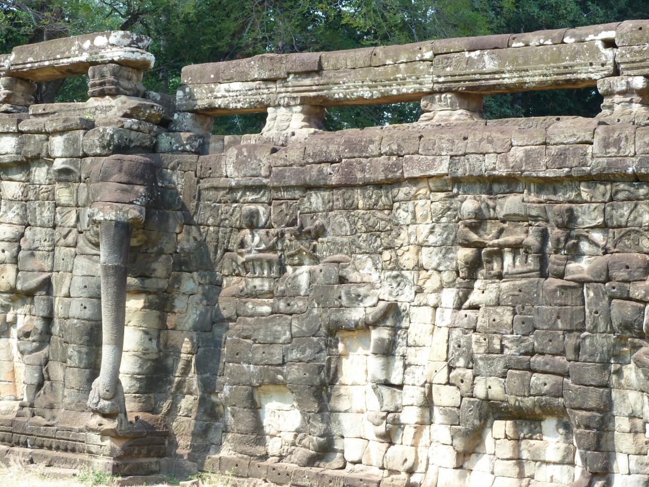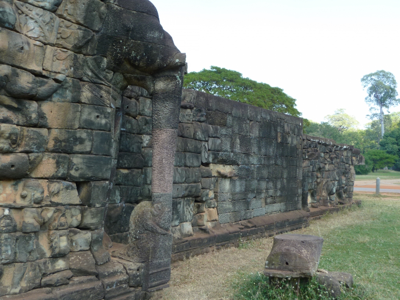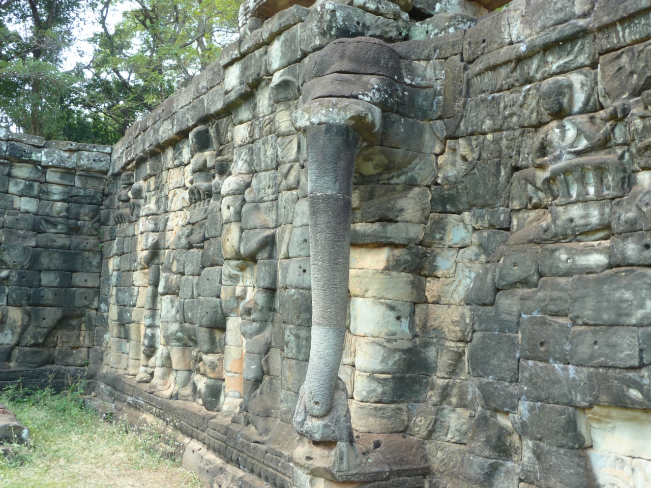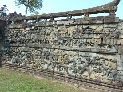 12世紀後半、ジャヤヴァルマン七世によって創られ、王族の閲兵などに使われた王宮前にあり高さ3m、長さは300m以上、東側壁にはその名のとおり象のレリーフが見られ、また中央ブロック側壁にはガルーダ像レリーフがならんでいる。300m以上の壁に象、ガルーダの彫刻が並んでいる光景は壮観です