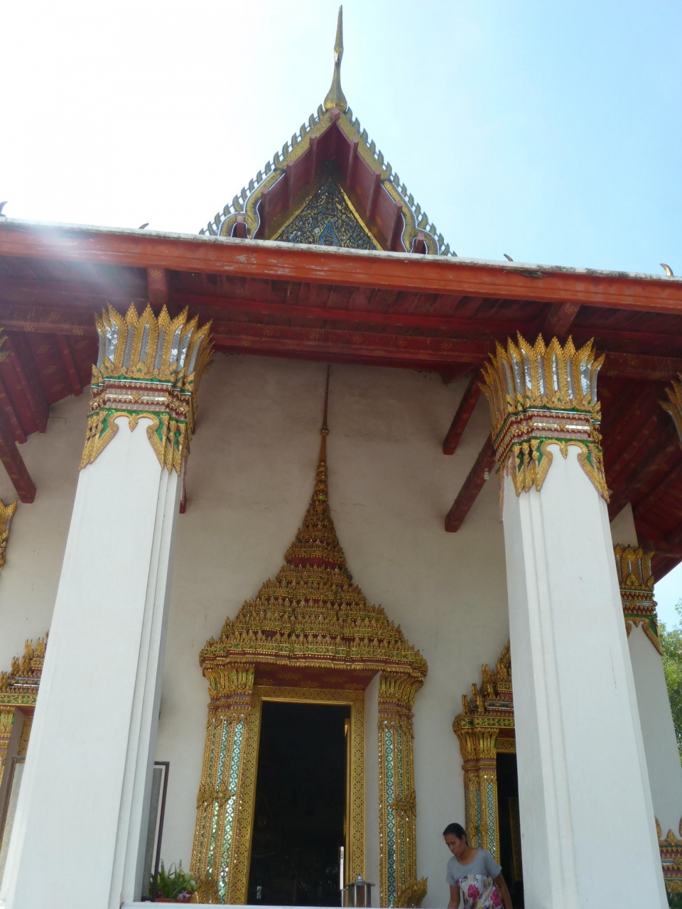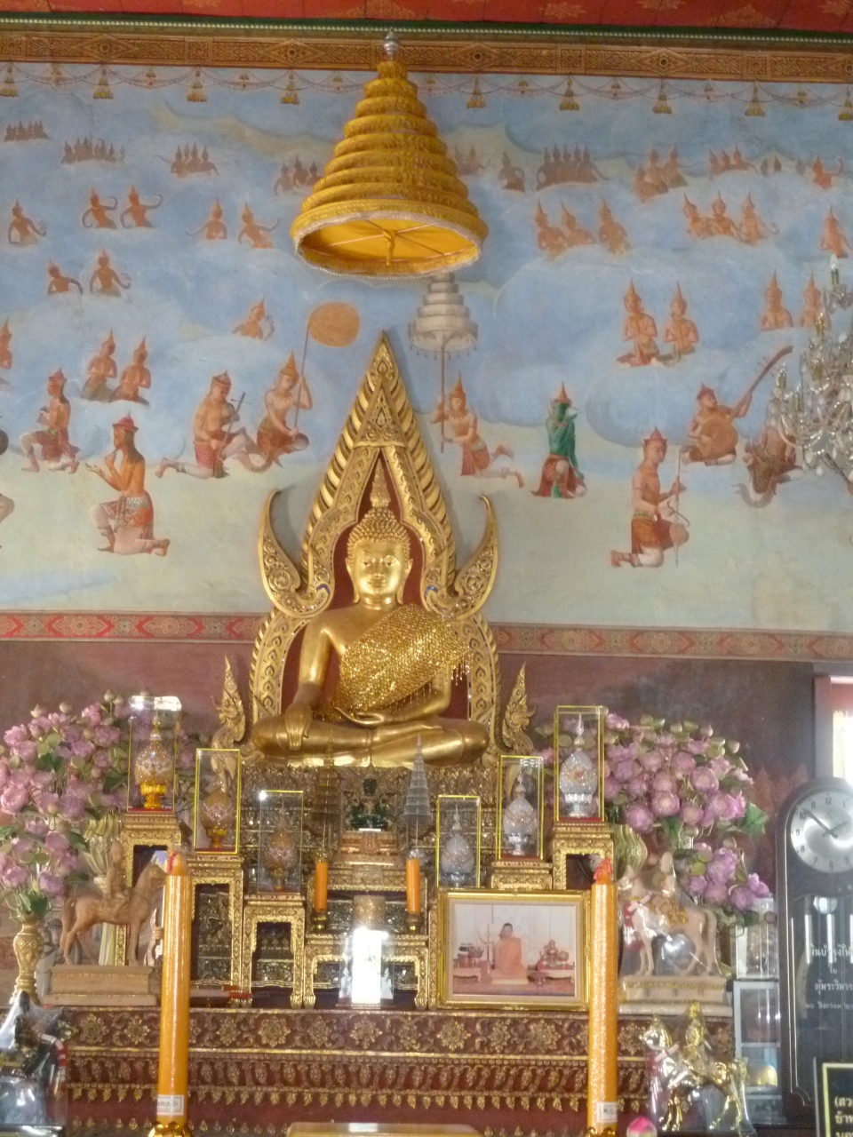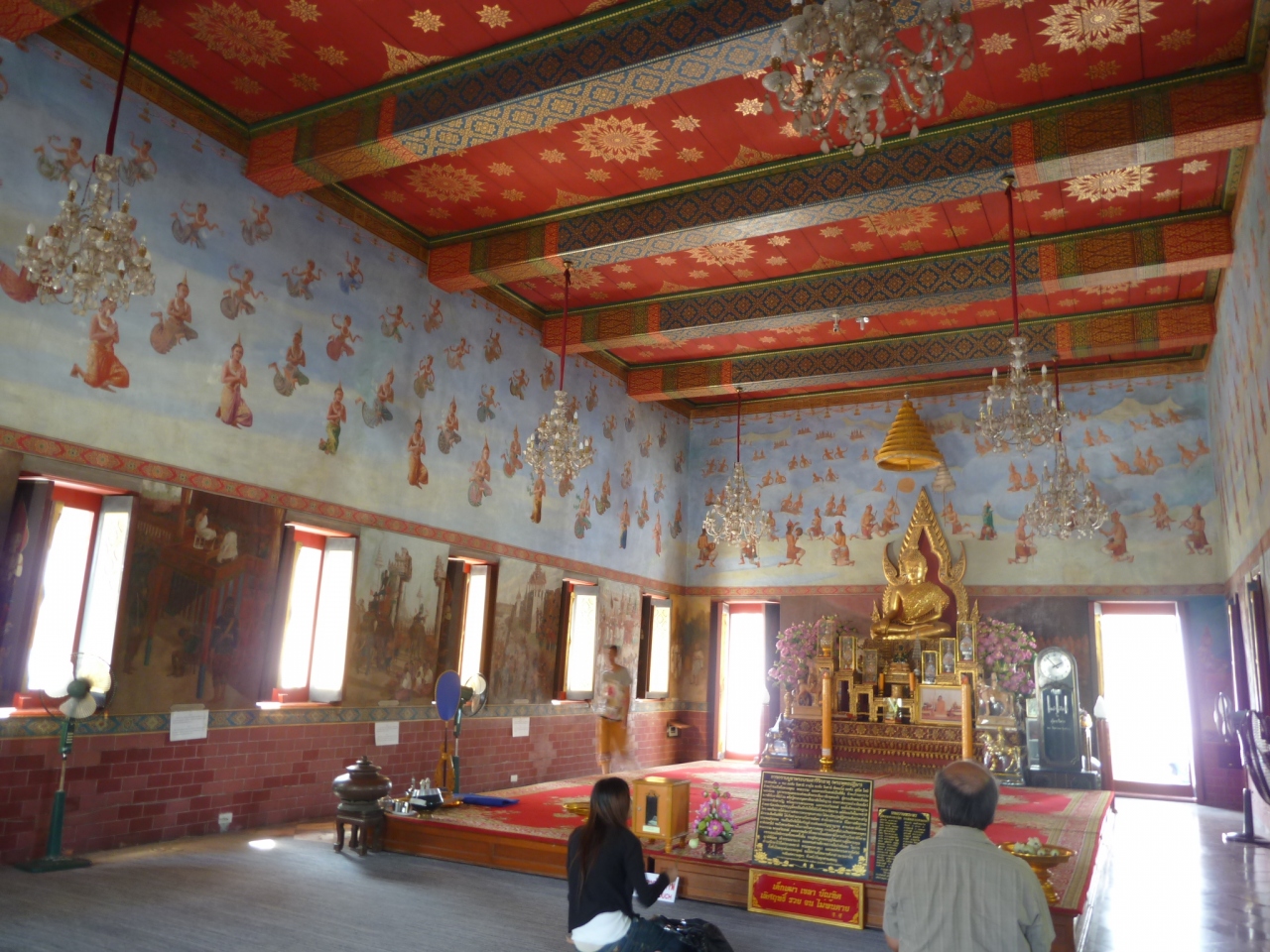 自転車でかなり迷いつつ到着。中の壁画がきれい。赤い壁に金の縁取りがところどころ。淡い水色の空にたくさんの飛天が描かれています。数名のタイ人の方が真剣にお祈りをされていました。地元の方は日常的にお祈りにくるのですねぇ。