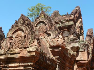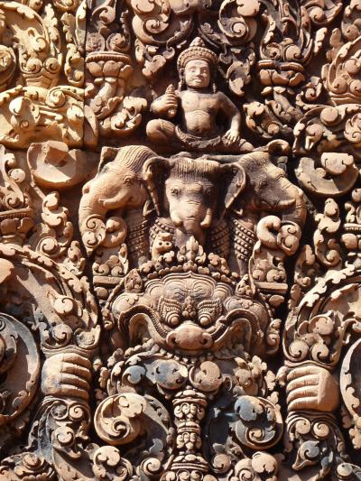 私がアンコールワットに行って、会いたかった彫像があるバンテアイ・スレイ(女の砦)。その名の通り、美しいアプサラ・デバターが出迎えてくれました。中でも一番有名で一番優美な「東洋のモナリザ」さん。あまりの人気のため、遠くからしかお顔を拝顔することはできません。このために当時一番ズームが大きいデジカメを買い、面会に備えました。やっと会えて、テンションアッーープ。やはり品がある。遺跡自体もレリーフが細かく緻密に彫られていました。赤い石で彫りが深いので陰影がより出てフォトジェニック。午前中に行くと暑くないし、朝陽を浴びて神々しかったです。少し距離がありますが、かなり見応えがあります。とにかく暑いので熱中症対策を。