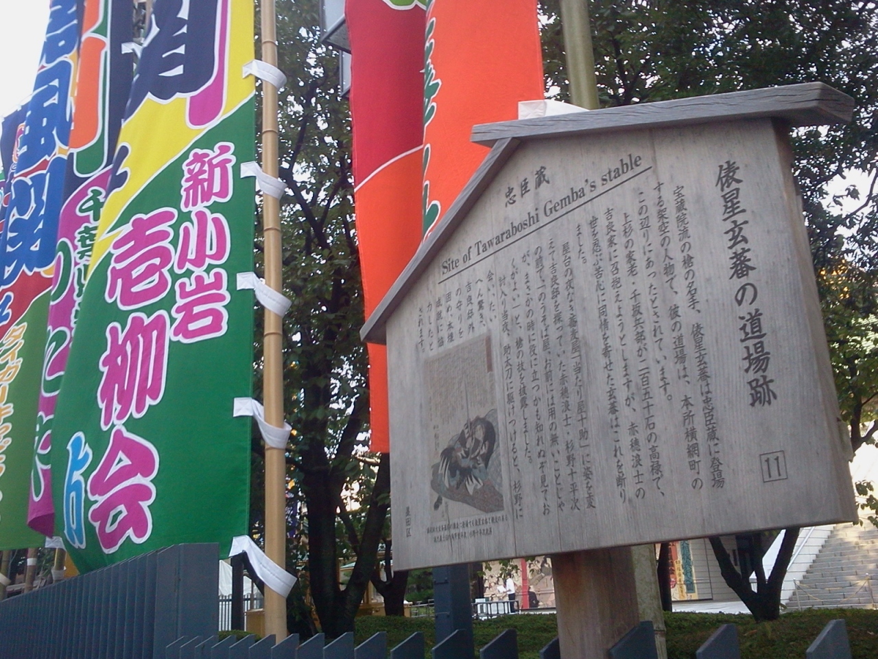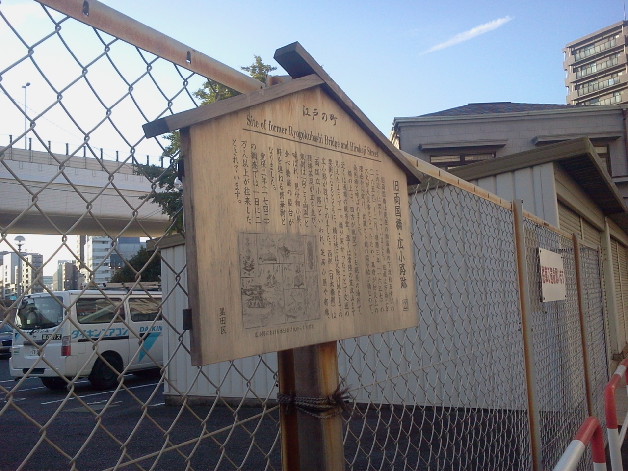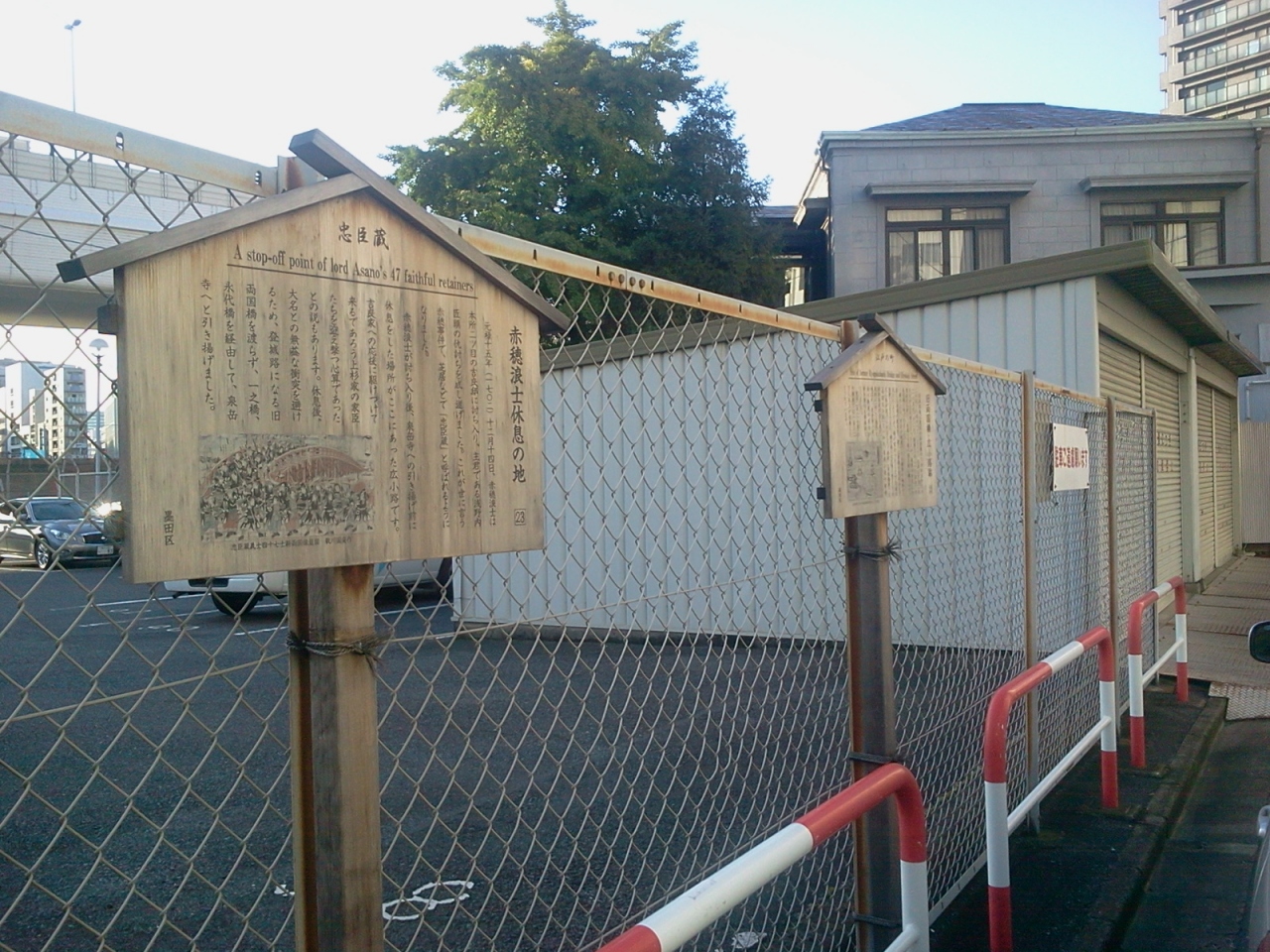 吉良邸討ち入り後、泉岳寺に向かう前に四十七士が休息をとったとされる場所です。いまとなっては、高速の高架下に駐車場があるだけで、当時をしのぶものは全くありません。とはいえ、血塗られた戦い後、両国橋の東詰めに集結した忠臣蔵の男たちはどんな思いで隅田川を見つめていたのでしょうね。。。