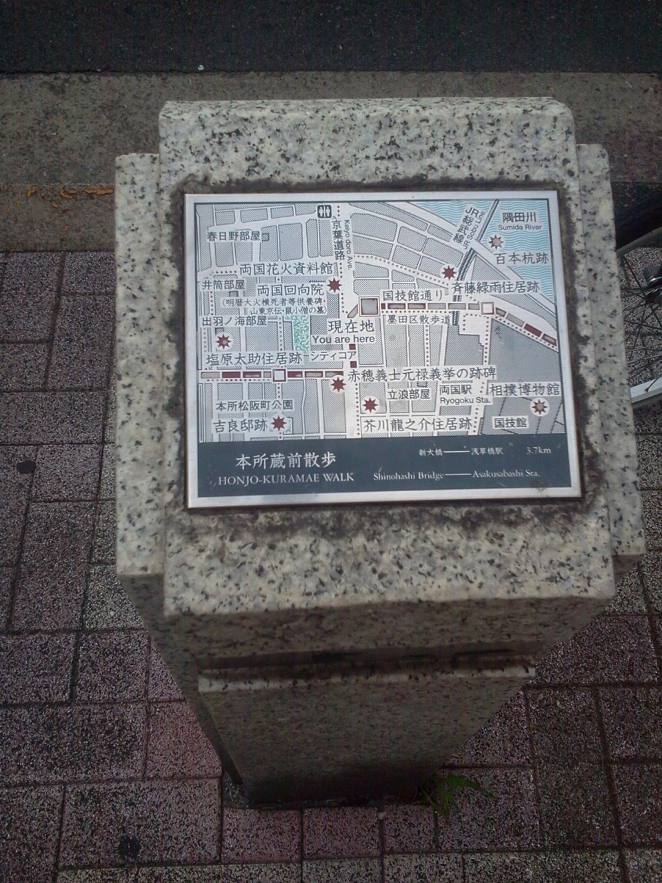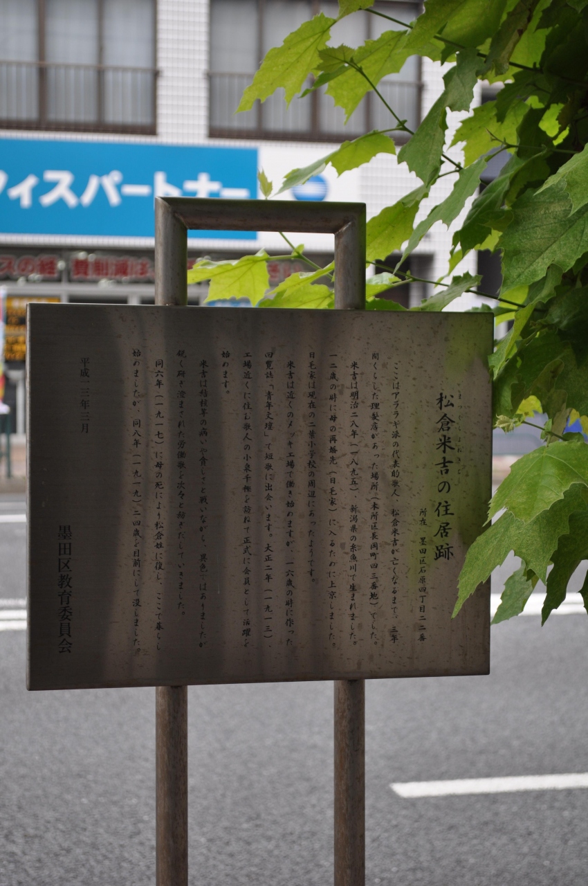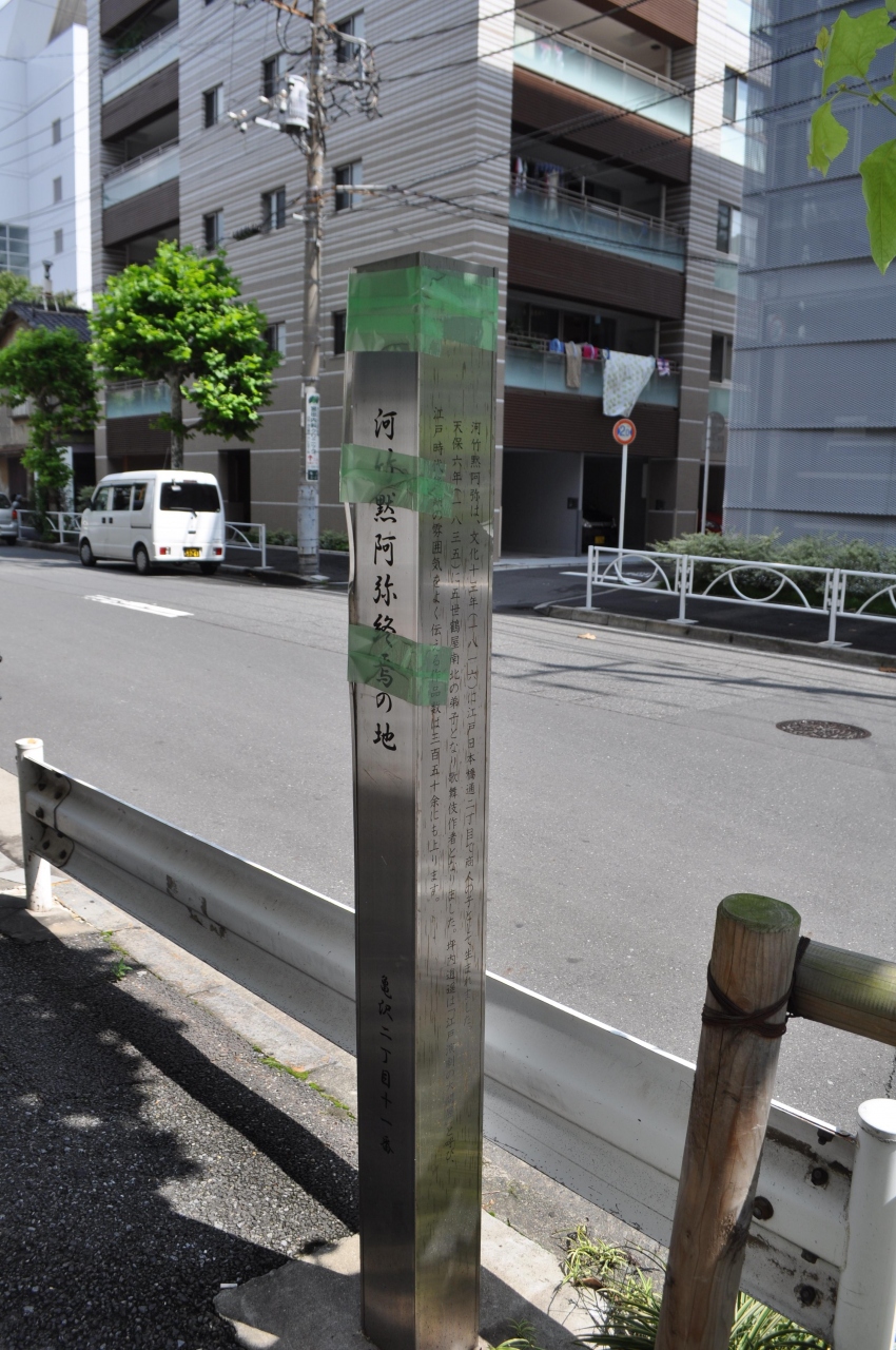 江戸時代幕末から明治にかけて活躍した歌舞伎狂言作者ですが、1816年生まれで1893年没というと、そんなに昔の方ではないわけですね。裕福な商家に生まれて放蕩三昧だったそうです。泥棒が出てくる「白浪物」でヒット作を生み出しますが、その大泥棒のモチーフは、同じ本所エリアで捕まって首をはねられた大泥棒である日本左衛門だったりします。結構ワイドショー系のネタが歌舞伎になってたんですね。。。。とはいえ、見応えがない目印だけが残っています。