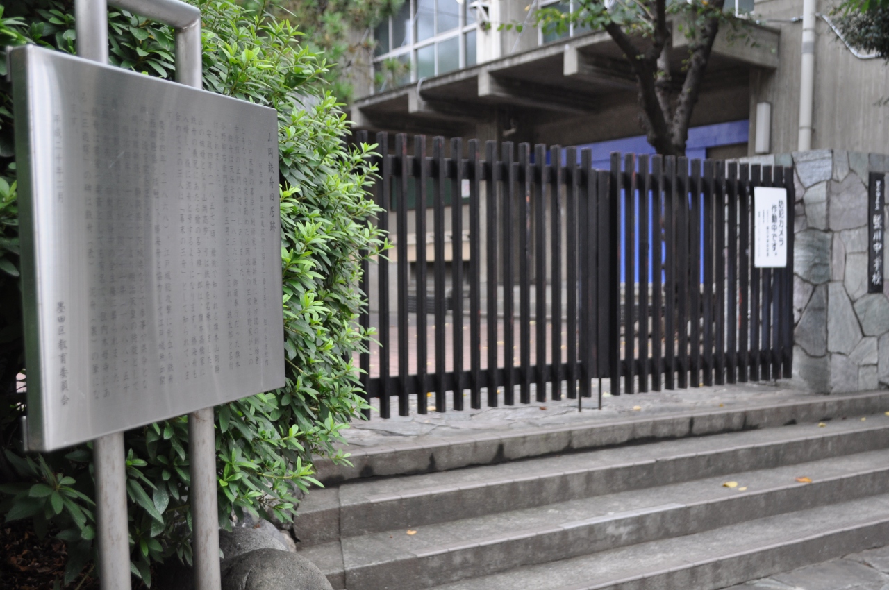 幕末から明治にかけて活躍した剣術家の山岡鉄舟の生家小野家が堅川中学校の校門辺りにあったそうです。近くにはあの勝海舟の家もあったので、幕末の大物が近所に住んでいたことがわかりますね。大物ご近所さん同士、集まって話し合いなどしていたんでしょうか。幼少のころ、明治天皇の剣道の練習相手になった時、ほかの子供がすべて負けてしまうのに対し、鉄舟だけはしっかり勝ってズルをしなかったという話も伝わっています。子供のころから大物の器だったんですねぇ。