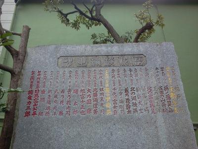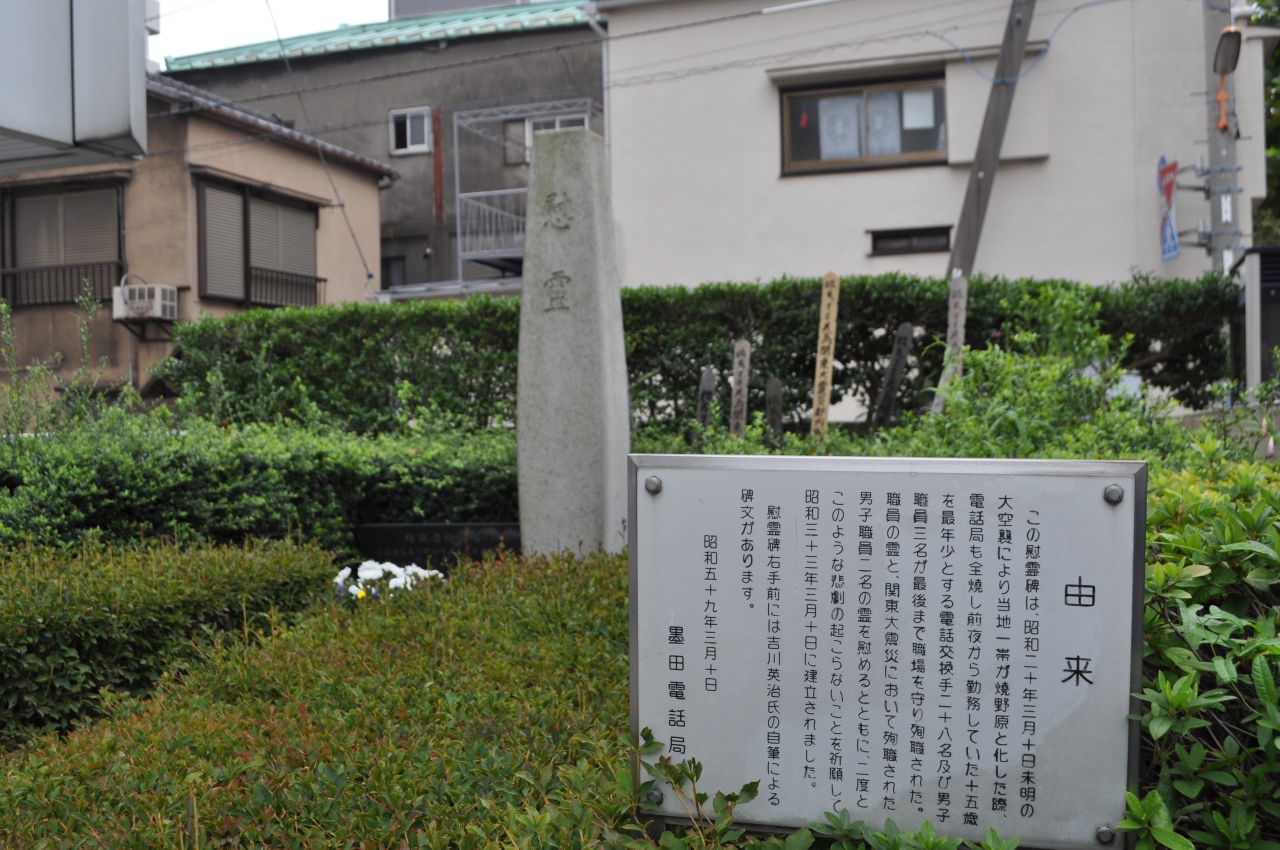 三ツ目通りに面したNTT石原ビルノ庭に、白い入ってすぐ右手に慰霊碑があります。1958年(昭和三十三年)3月10日に建立。大空襲の夜に業火の中で最後まで電話交換の職務を遂行した殉職者および関東大震災での殉職者を慰霊しています。電話交換手は主に十代から二十代の若い女性がつとめており、軍から通信施設を守れと命令されていたため、周囲が火に包まれても職場を放棄することはなかったそうです。今自分の立っている場所が、猛火に包まれて砲撃を受けていたなんて、考えもよらないことですが、それが史実なのですね。