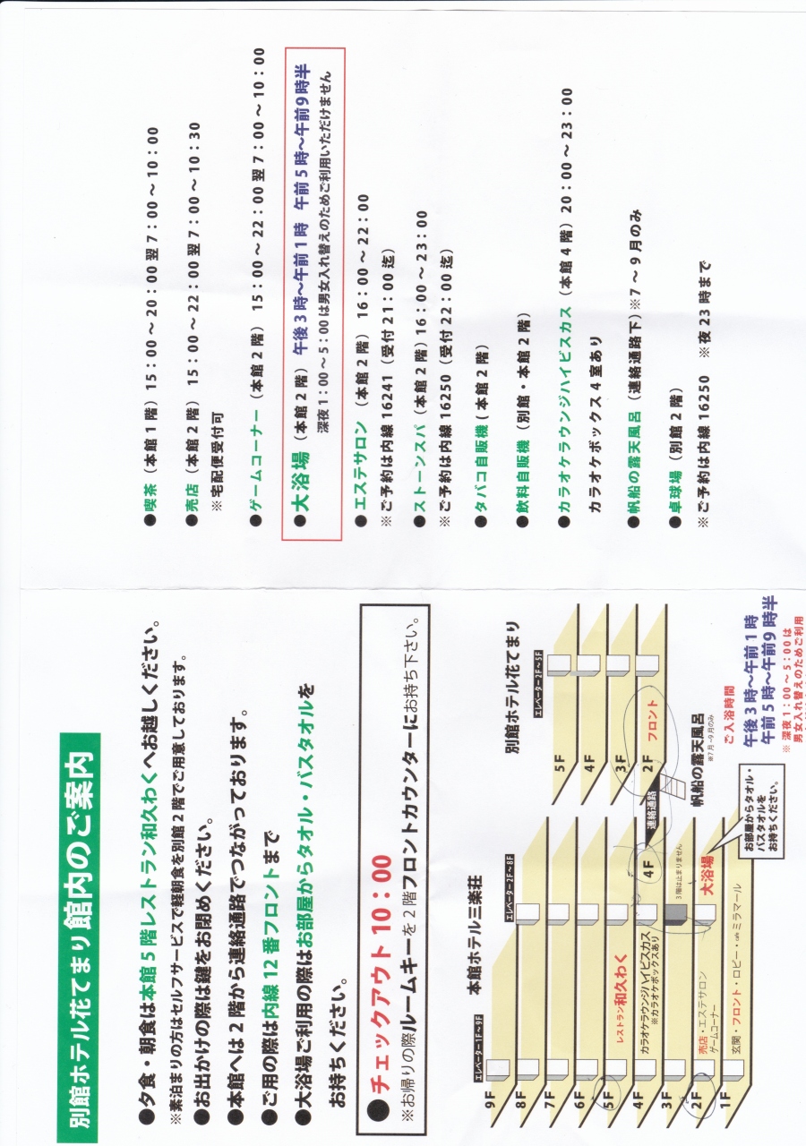 大浴場や食事は渡り廊下でつながったホテル三楽荘を利用できます。