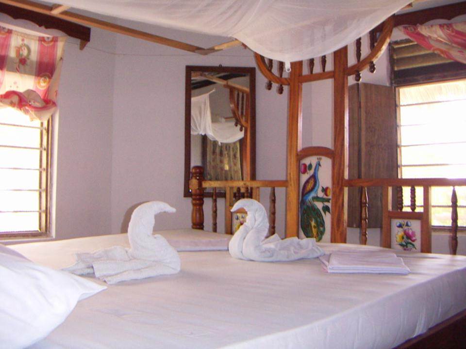 ストーンタウンから乗り合いバスで3時間、東海岸のパンジアニビーチで、色んな宿を見て廻った結果、イーストコーストヴィジターズインに宿泊しました。ブーゲンビリアが咲き乱れる敷地にある、3部屋とバスルームの小さな家みたいなバンガローは、清潔で居心地快適。スタッフは親切で誠実、おばさんのベッドメイクは毎日違う演出で、花びらをまいたり、バスタオルで白鳥をつくっておいてくれたりと粋で、リゾート気分も盛り上がりました。朝食付きで1泊4000円(2人で)ほどでした。設備、料金共、その辺りでの中流といった感じだと思います。
