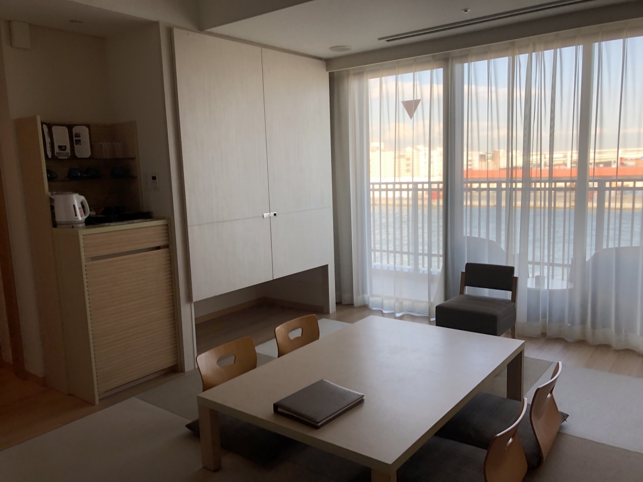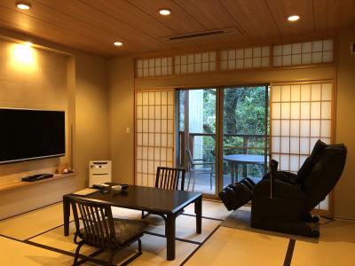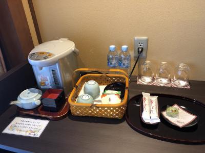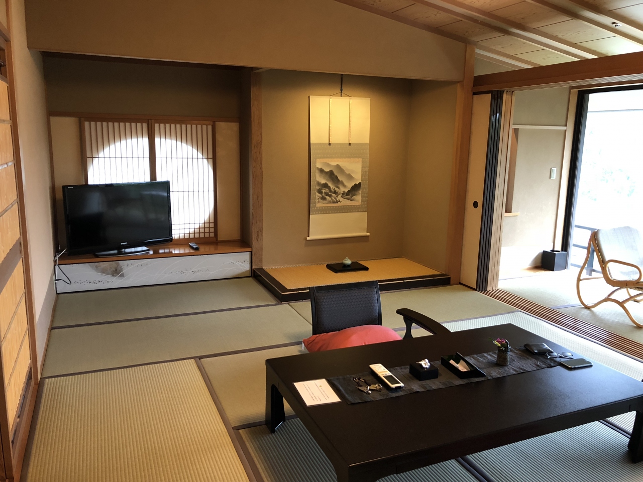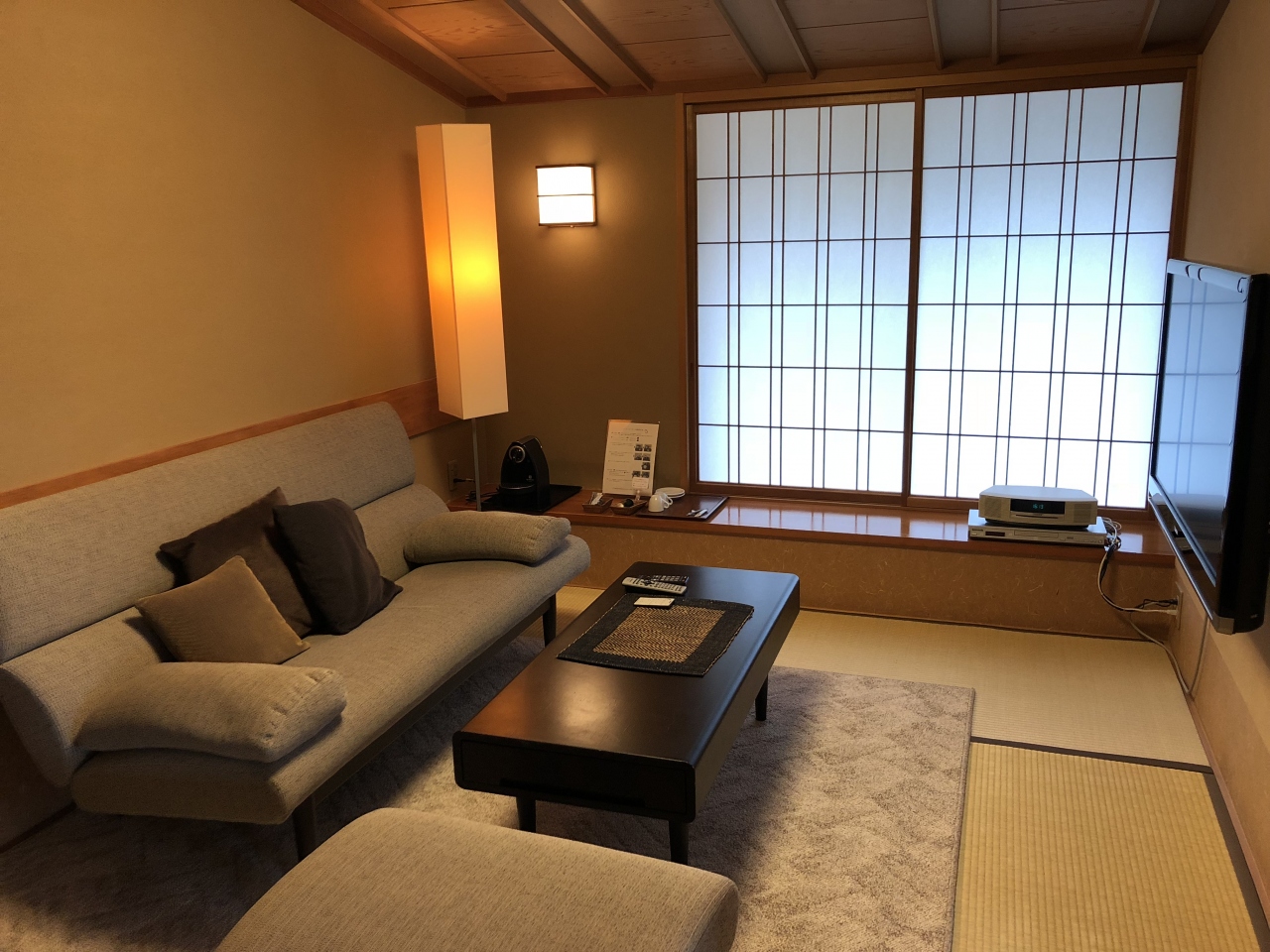 眺望の良い広縁付きの主室とは別に六畳の副室があるのですが、ソファや壁掛けテレビ、珈琲マシンなど寛ぐための備品が揃っていました。