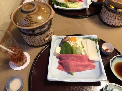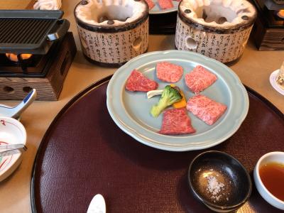 飛騨牛がメインの夕食。朝食はバイキングで種類も豊富。眺めの良いレストランでの食事は気持ちの良いものです。