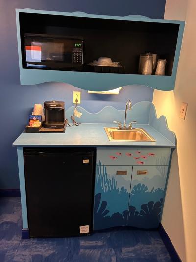 小さな流し台、電子レンジもあり早朝からフードコートに行かなくても
