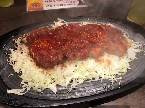 熱々の鉄板にキャベツの千切り、とんかつが乗っていて