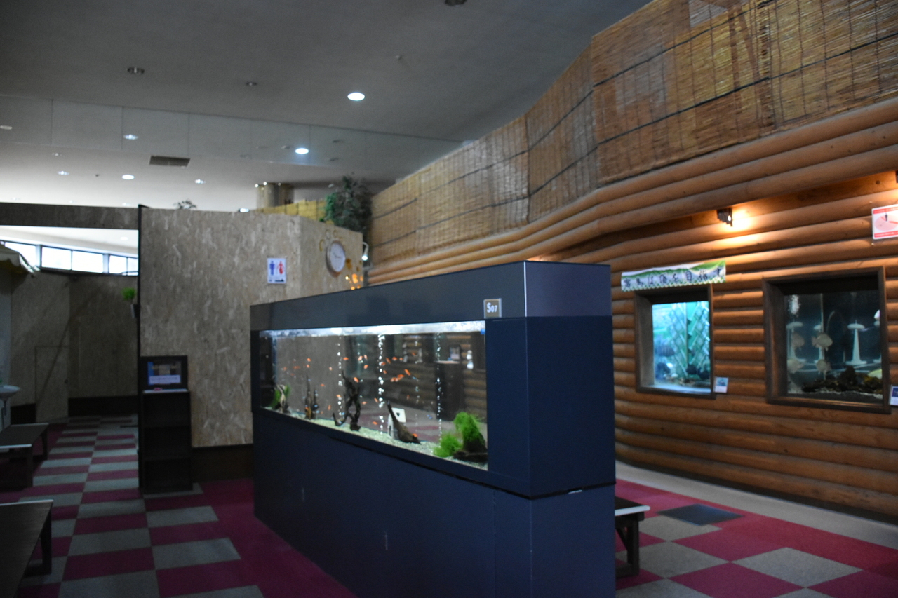 二階へ行ってみるとトイレと会議室のような場所に現在はアートが飾ってありましたが、魚はいません