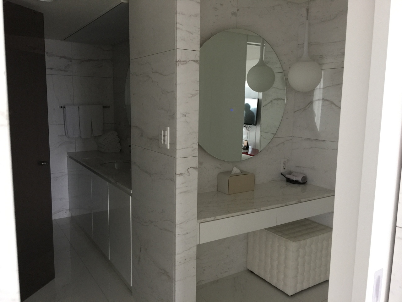 とても広く、キッチン・ダイニングスペース、洗面台とは別に化粧スペース、スーツケースまで入る収納スペースも沢山あり広々と変えました。