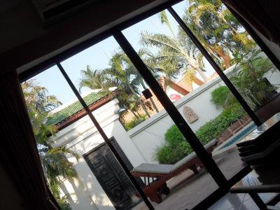 バンコクからのモーターウェイをバンコクパタヤ病院に行く方向にあります。ビーチからは遠いですが、静かでのんびりできます。近くにレストランはないのですが、ホテルのルームサービスは安いです。もちろん、プールビラです。部屋は広いですよ。オススメです