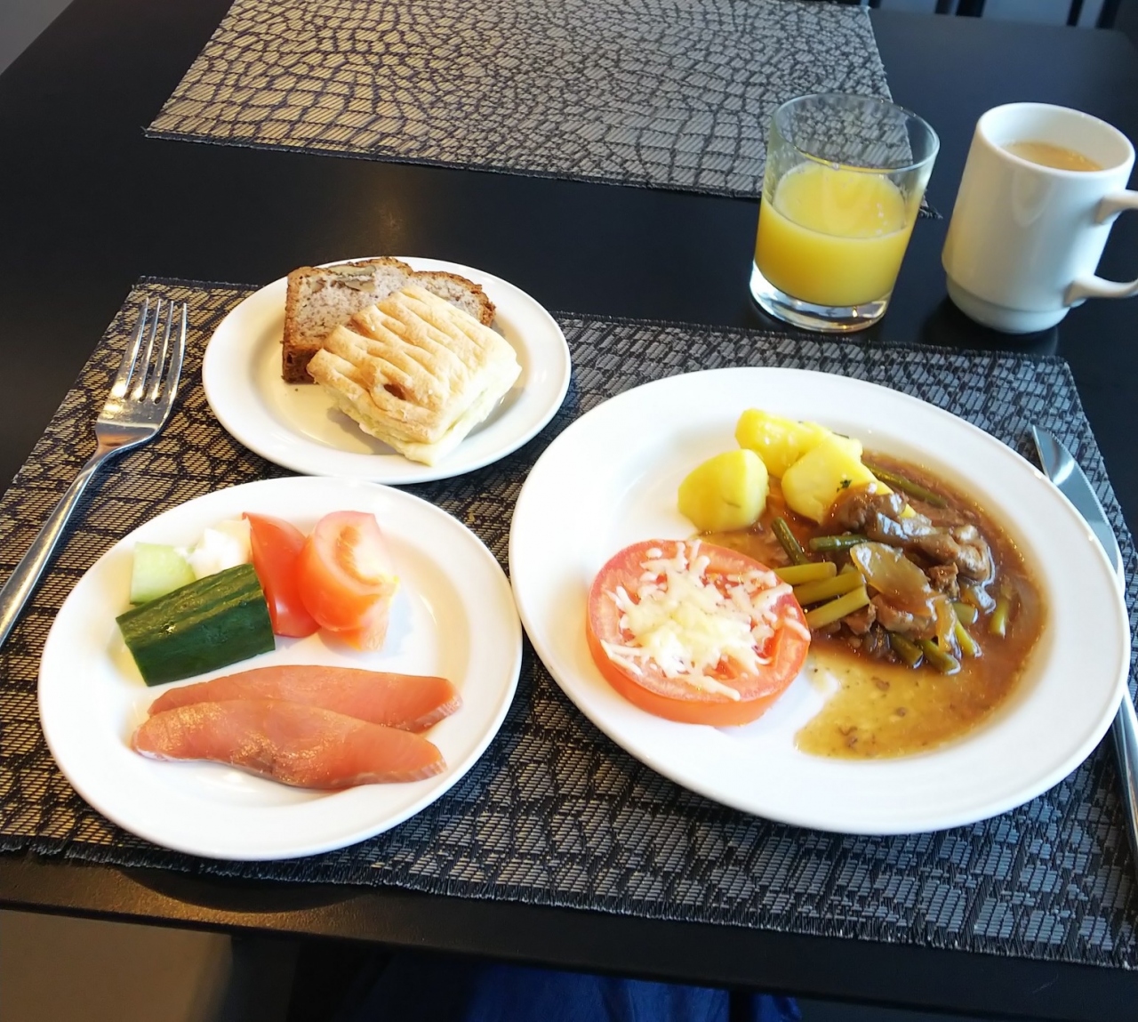 JALのサファイア会員です。本館5階の代替ラウンジは昼12時で終了だったため、4階のスカイラウンジアネックスを利用しました。人気のビーフカレーや蕎麦などの主食に加え、サラダやマフィン、ミニ鯛焼きなどのメニューがありました。