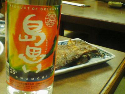 泡盛「島思い」のボトルを1本空ける。その後に写っているのは、「鮪(まぐ...