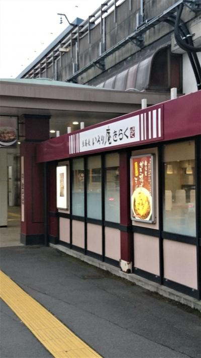 いろり庵きらくはJR東日本系列の駅そばチェーンである。ここは両国駅の改札を出た場所にある店。券売機でチケットを買うシステムで、どこの店も似たメニューであるが、この店の良い点は高い椅子の小さなテーブル席があること。
