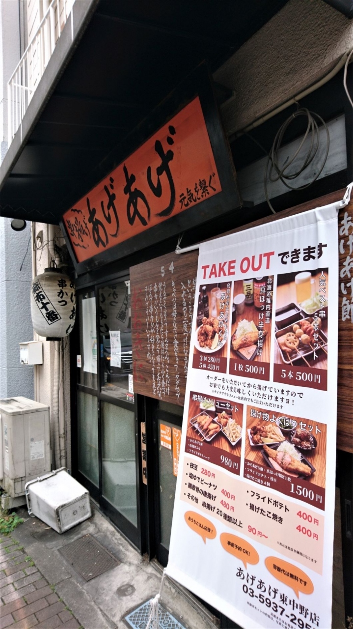 JR中央線東中野駅東口を降りて大久保通りまでの南方向へ下り坂にある商店街にある串揚げの店。コロナでアルコール類の提供ができないので、テイクアウトに力を入れていた。この手の店の前を通ると、いつまで耐え忍ぶのか気の毒な気がする。