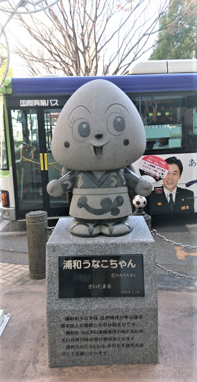 もともと沼地が多い土地なので昔は地元でうなぎがよく採れたので、浦和はうなぎが名物。今も市内各所にうなぎ店が多い。そこでできた浦和のゆるキャラがうなこちゃん。その像は西口のコルソと伊勢丹の中間位置の対面に立っている。