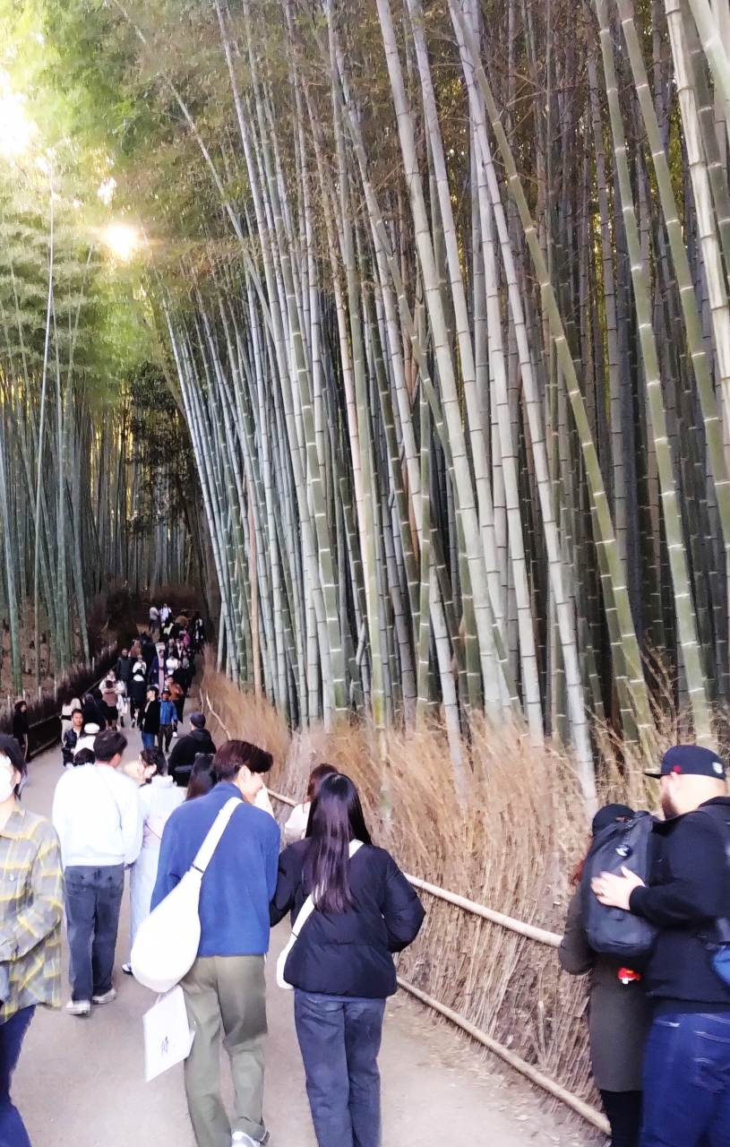 嵐山の山中にある見事な背丈の竹林の中を通る散歩道。確かにこれだけ立派なまとまった竹林は他では見られない。嵐山でも渡月橋とならぶ人気が高いスポットである。ちょっと勾配のある坂道になっている。一年中の観光客が多い。