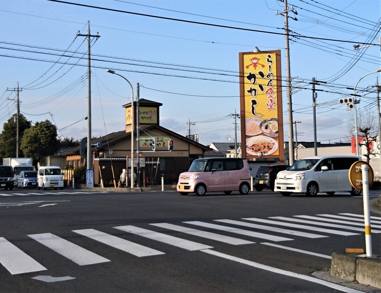 山田うどんは埼玉でよくみかける地元のうどん店チェーンである。黄色い地色に赤いかかしの看板は良く目立つ。この所沢郊外の交通量の多い交差点には、山田うどんとしてはめずらしいラーメン店がある。餃子なども食べられる。このタイプの店のメニューはなかなか良い。もっとふやしてほしいものだ。