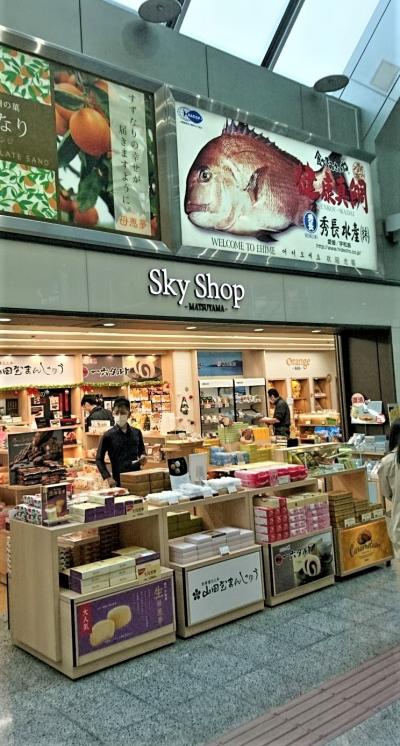 松山空港ターミナルビル1階の土産物店。一六タルトや山田屋饅頭など地元の銘菓を中心の品揃え。この隣に同系列の海産物など県産品のコーナーもある広い売り場。搭乗手続きをした後、ゲート入口がある2階にエスカレーターで真っ直ぐ上がることがら今まで見逃していた。